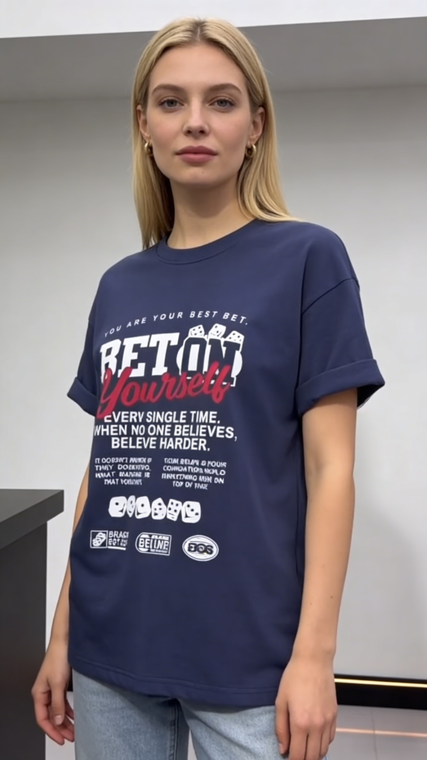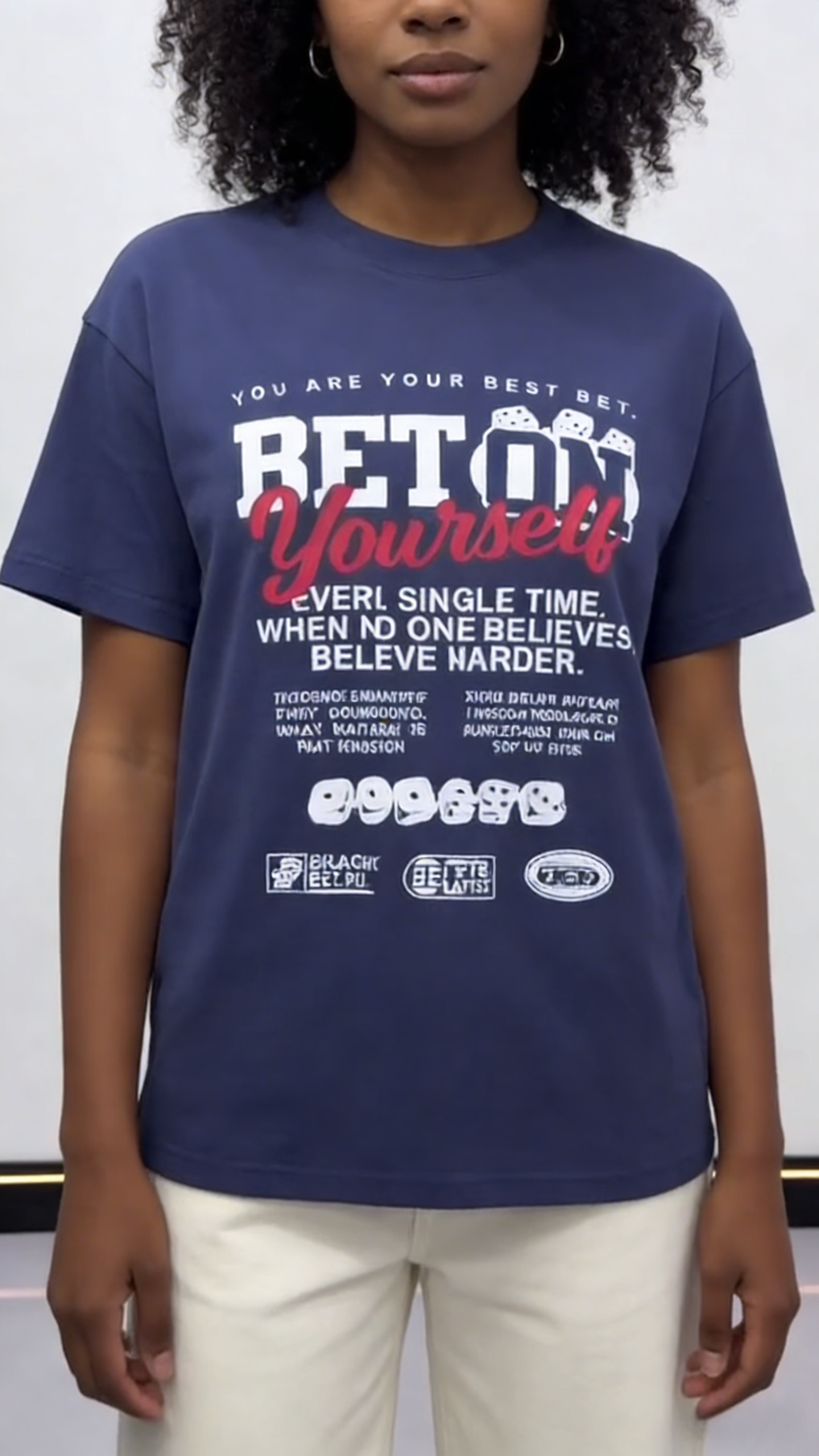 - Design: Motivational “BET ON Yourself” text graphic with dice & logo details