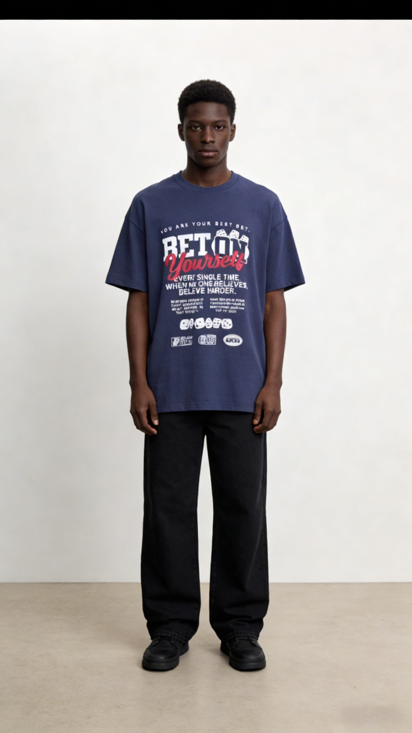 - Primary Keywords: 100% cotton T-shirt, oversized streetwear T-shirt, “BET ON Yourself” graphic tee, motivational quote shirt, wholesale cotton T-shirts