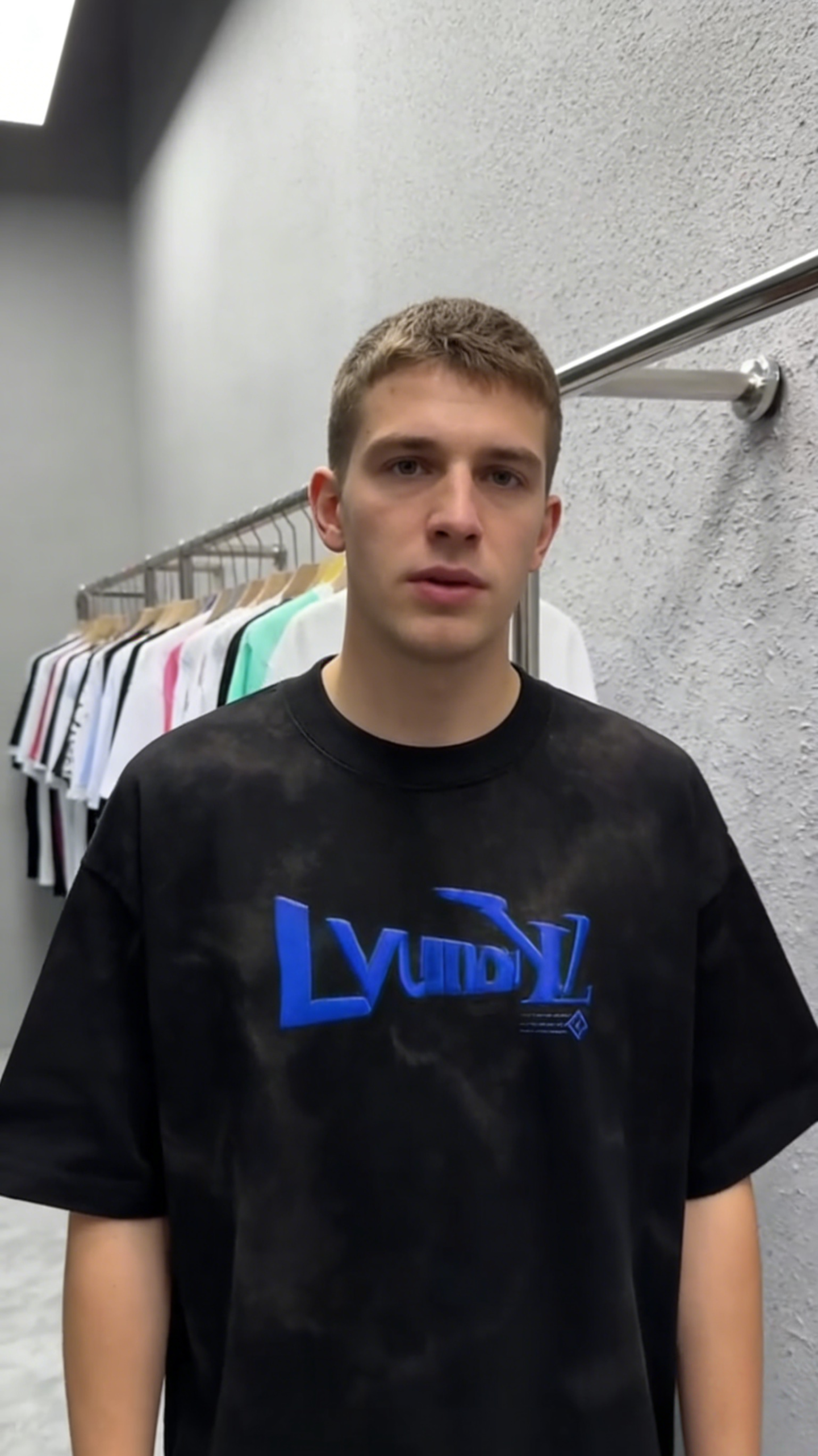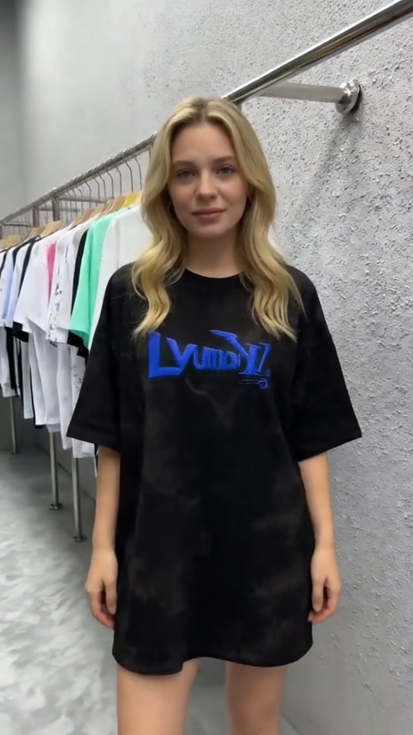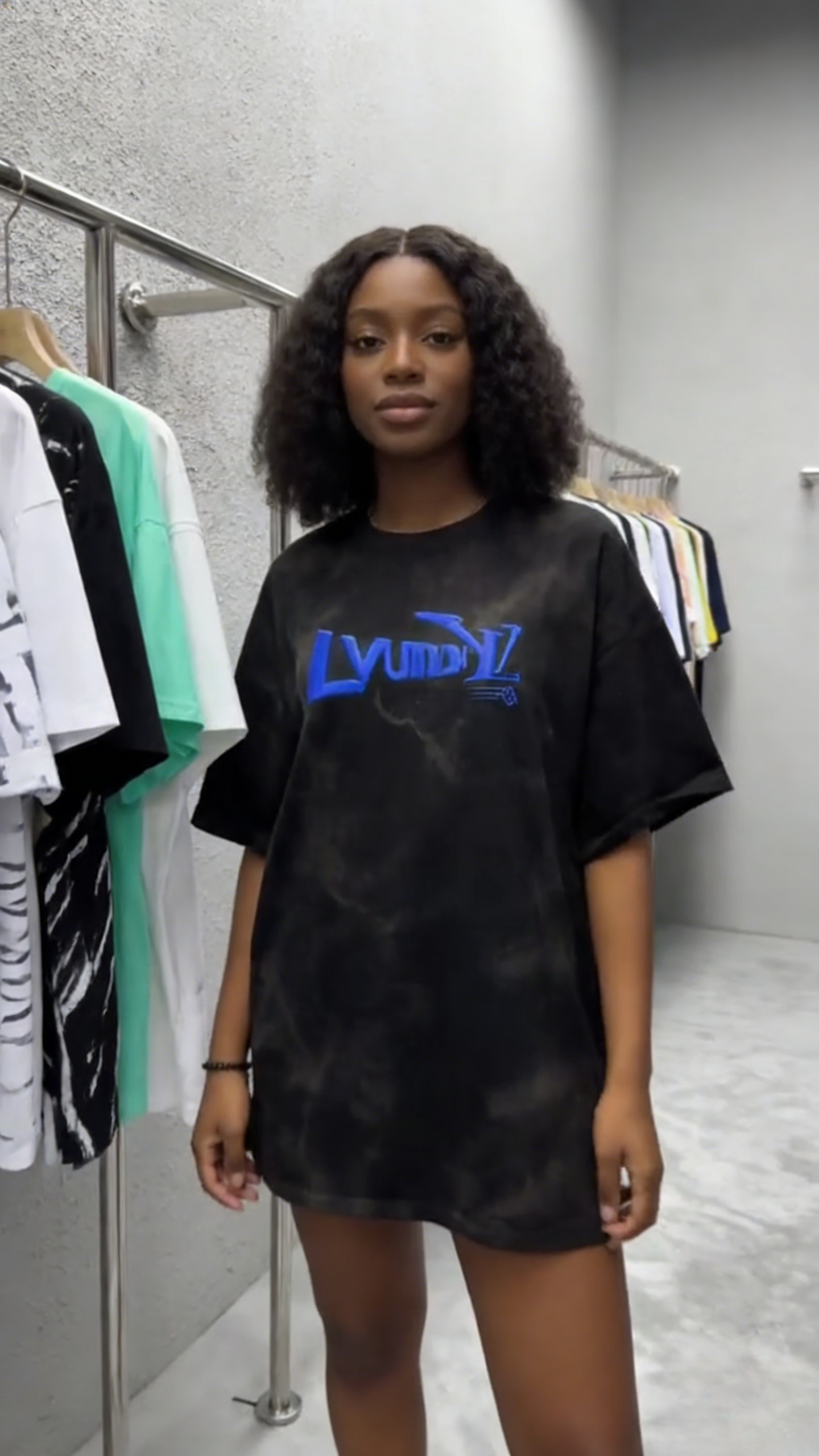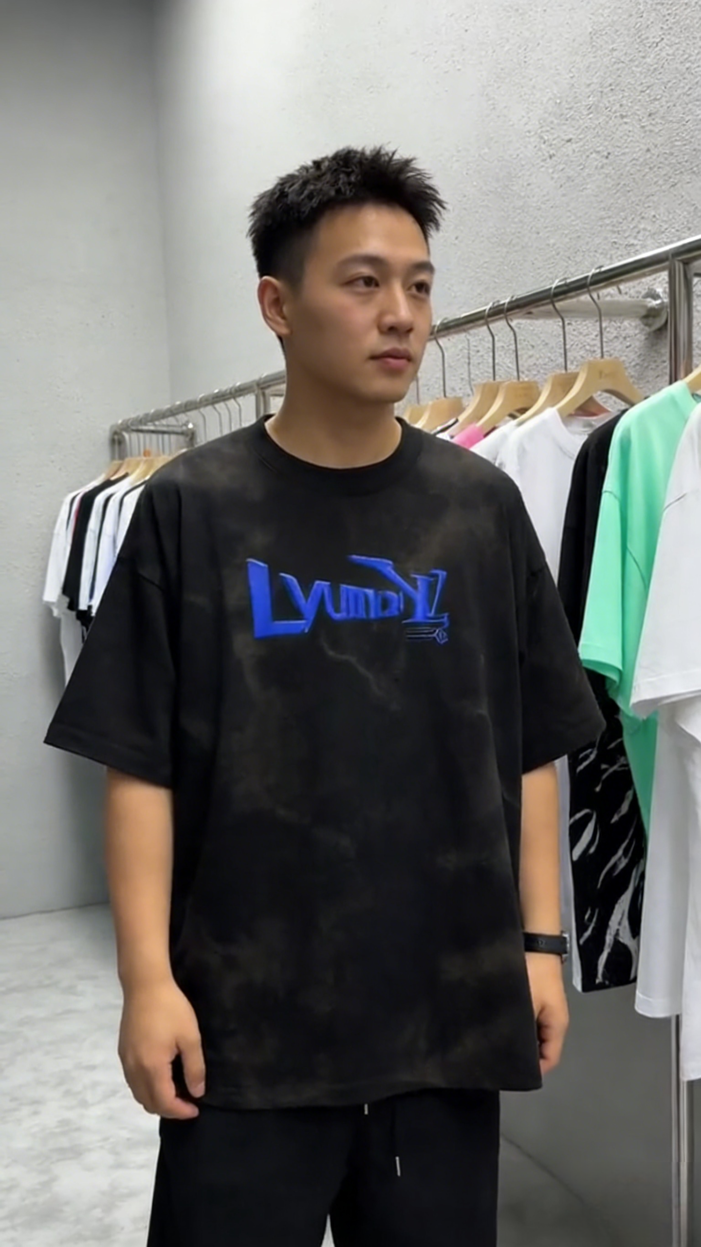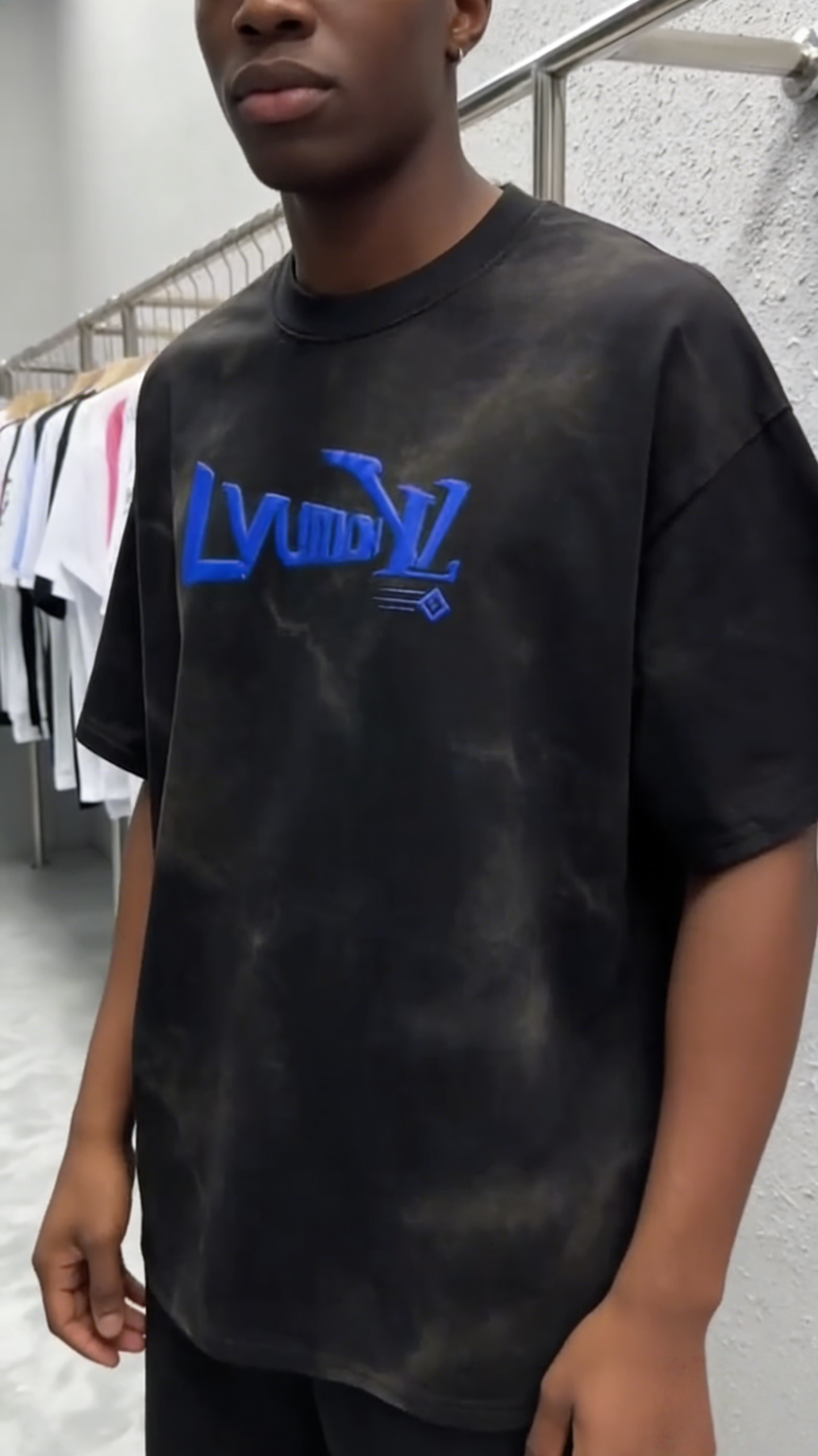 - Key Design Elements: Black tie-dye base with a subtle marbled effect, paired with a bold blue “LvumYL” graphic and small diamond-accented text, creating a minimalist yet striking streetwear look.