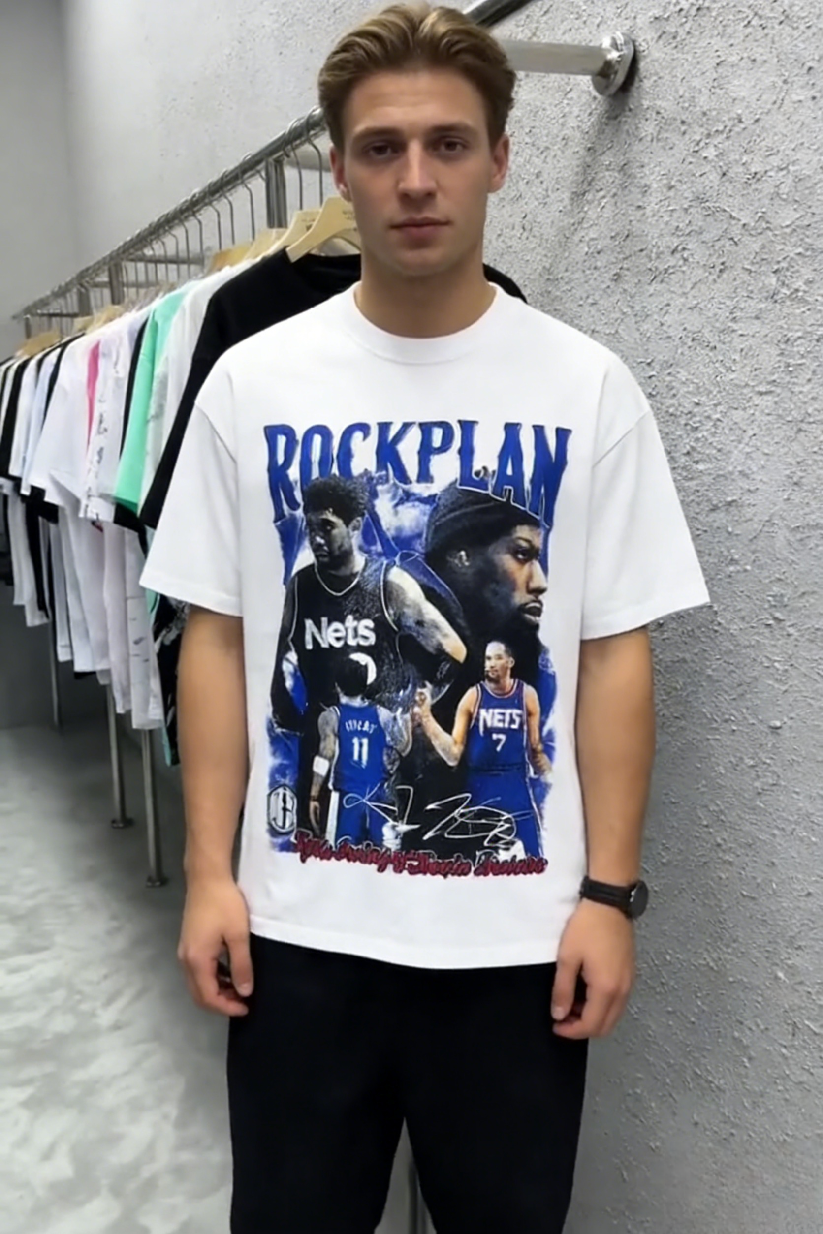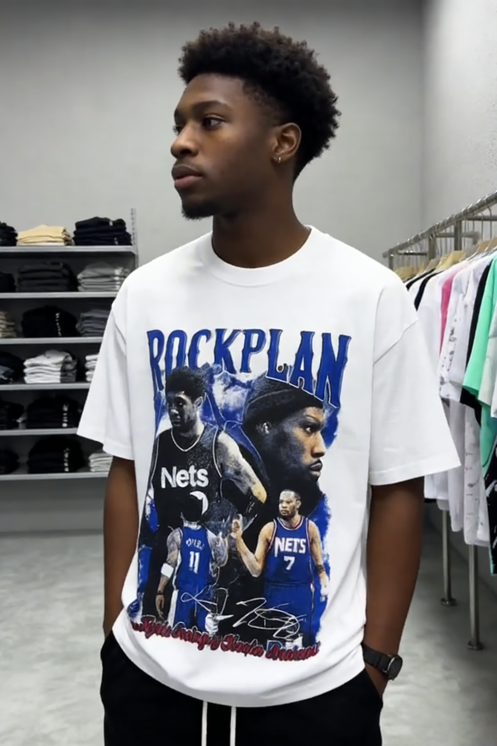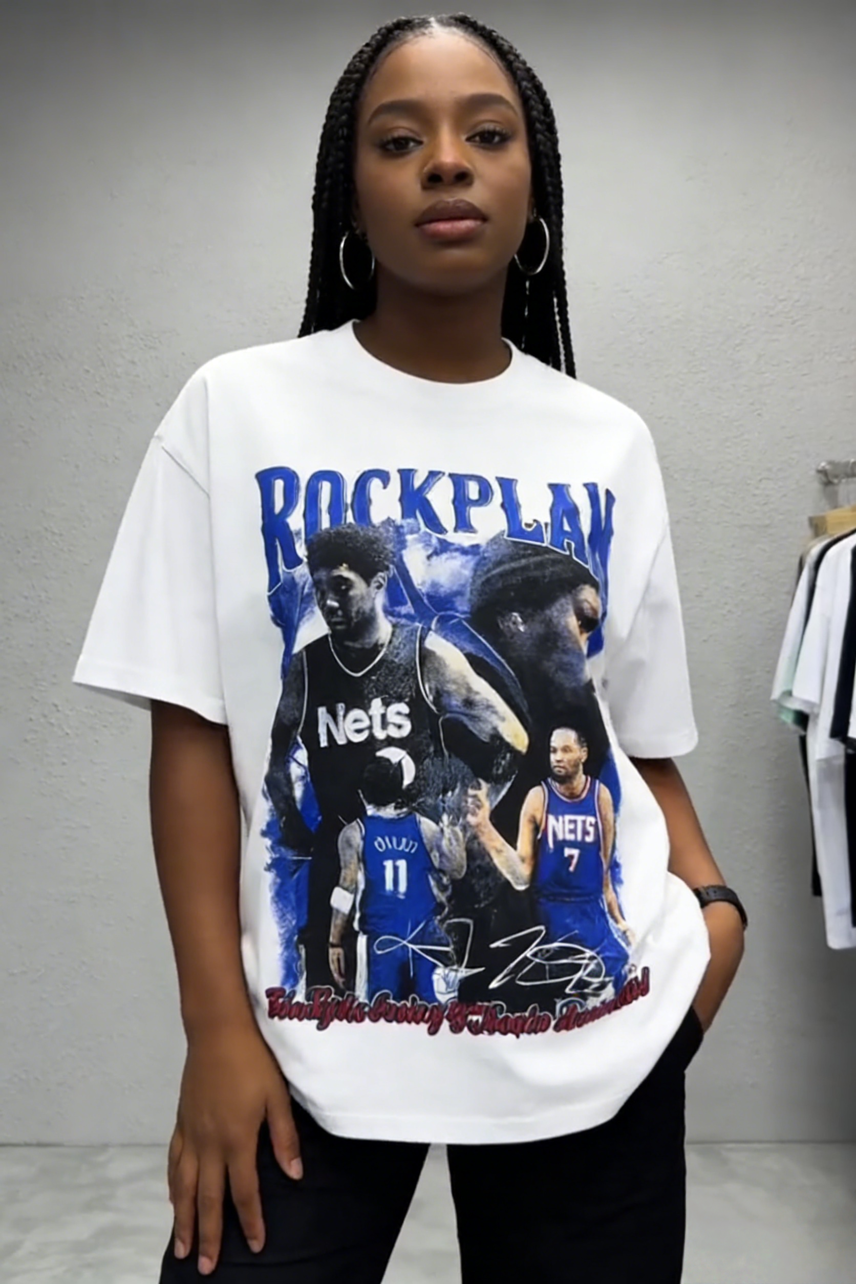 - Design: Vintage-style “ROCKPLAN” text with Brooklyn Nets basketball player collage graphic