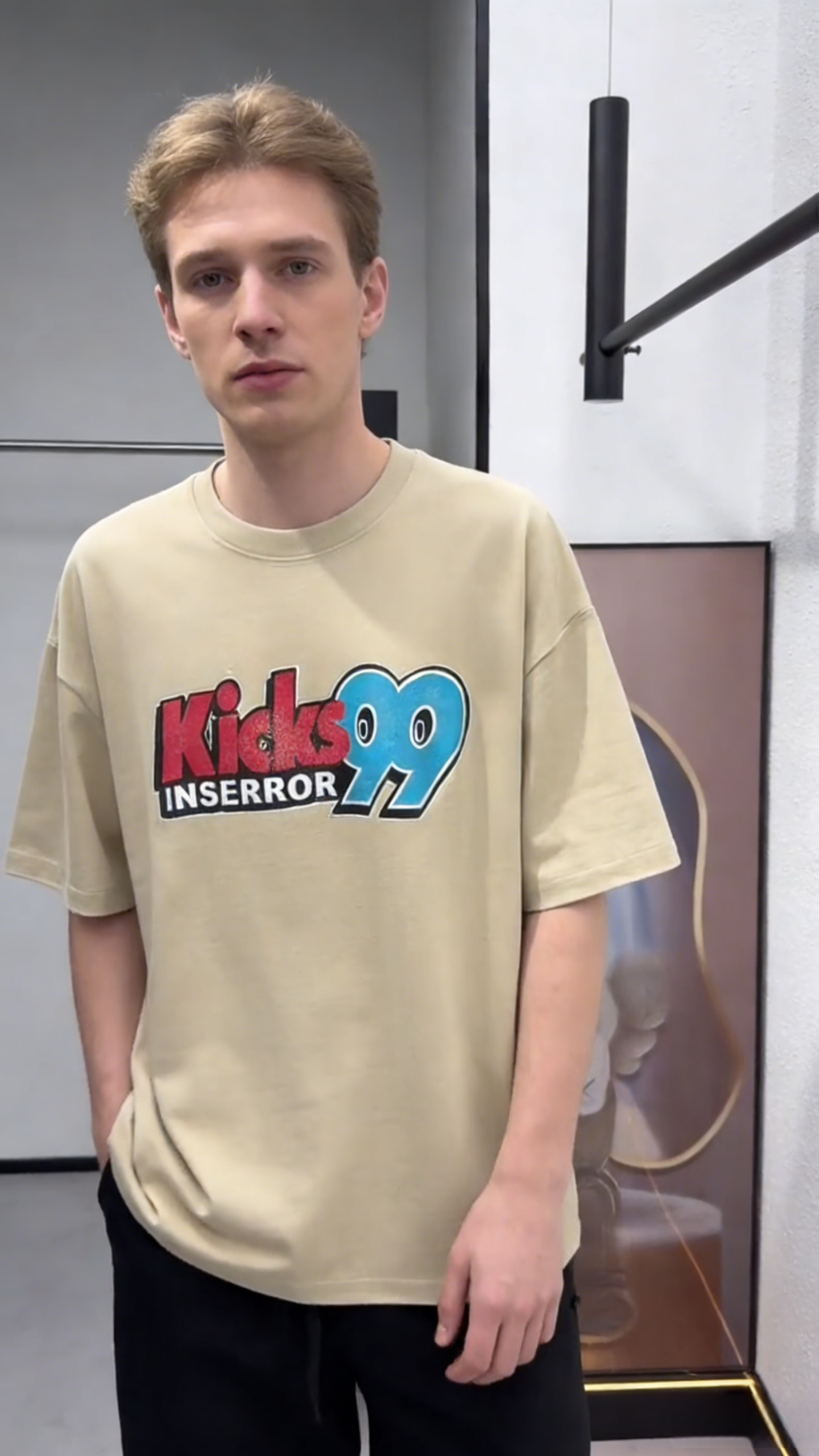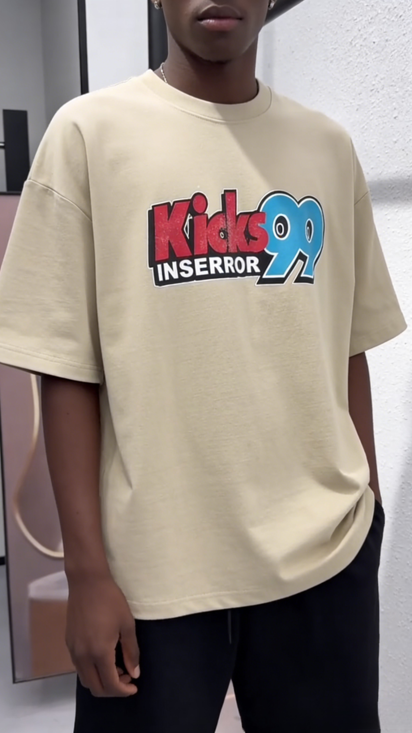 - Key Design Elements: Stacked “Kicks 99” lettering (red “Kicks” + blue “99” with eye details) and “INSERROR” text, creating a 90s streetwear/sportswear vibe.
