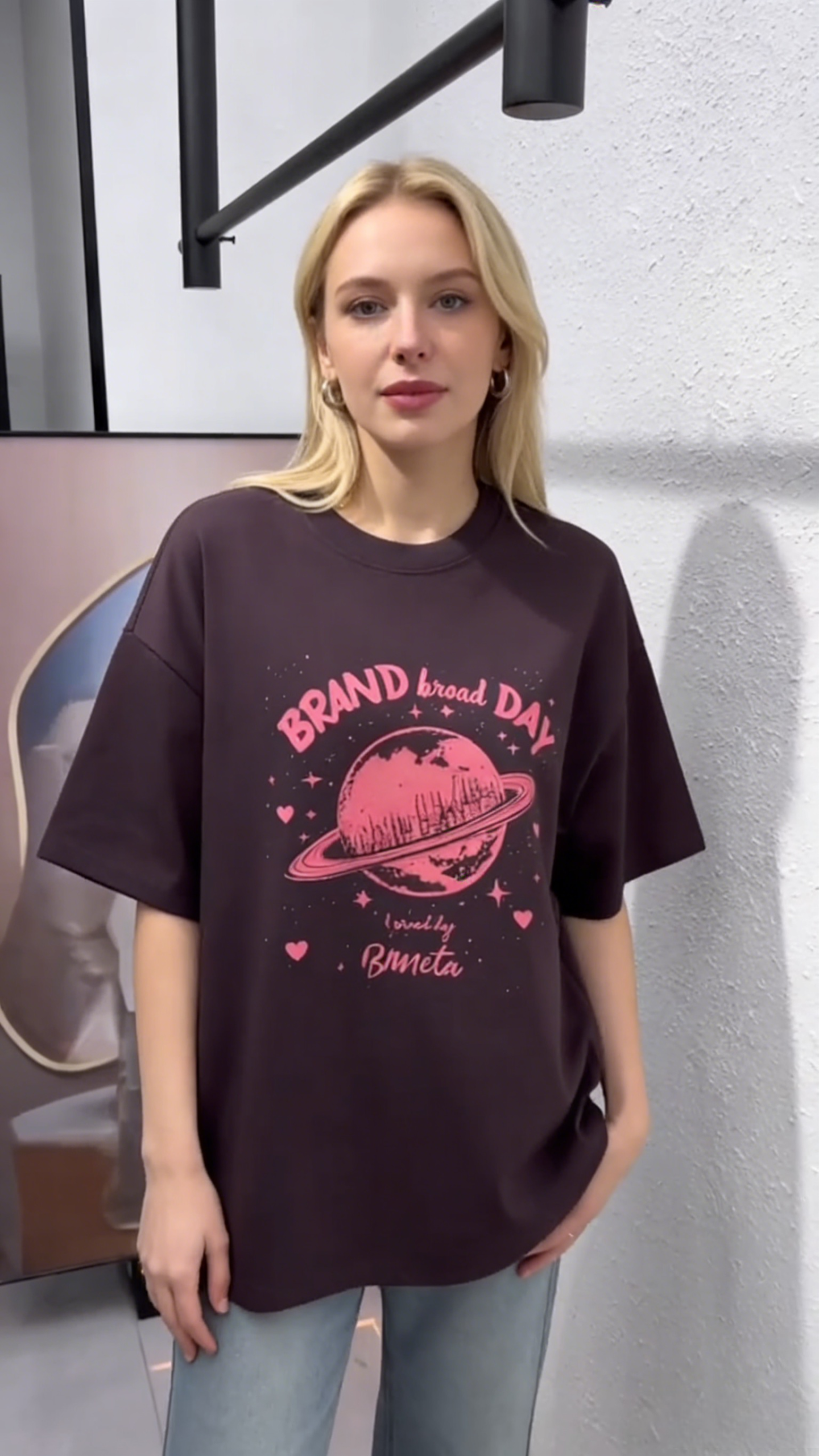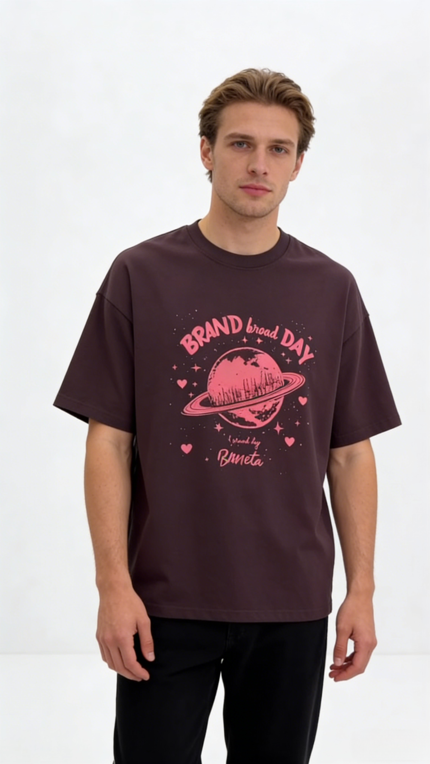 - Key Design Elements: A pink Saturn-style planet with cityscape details, surrounded by “BRAND broad DAY” text, stars, and hearts, creating a dreamy, retro vibe.