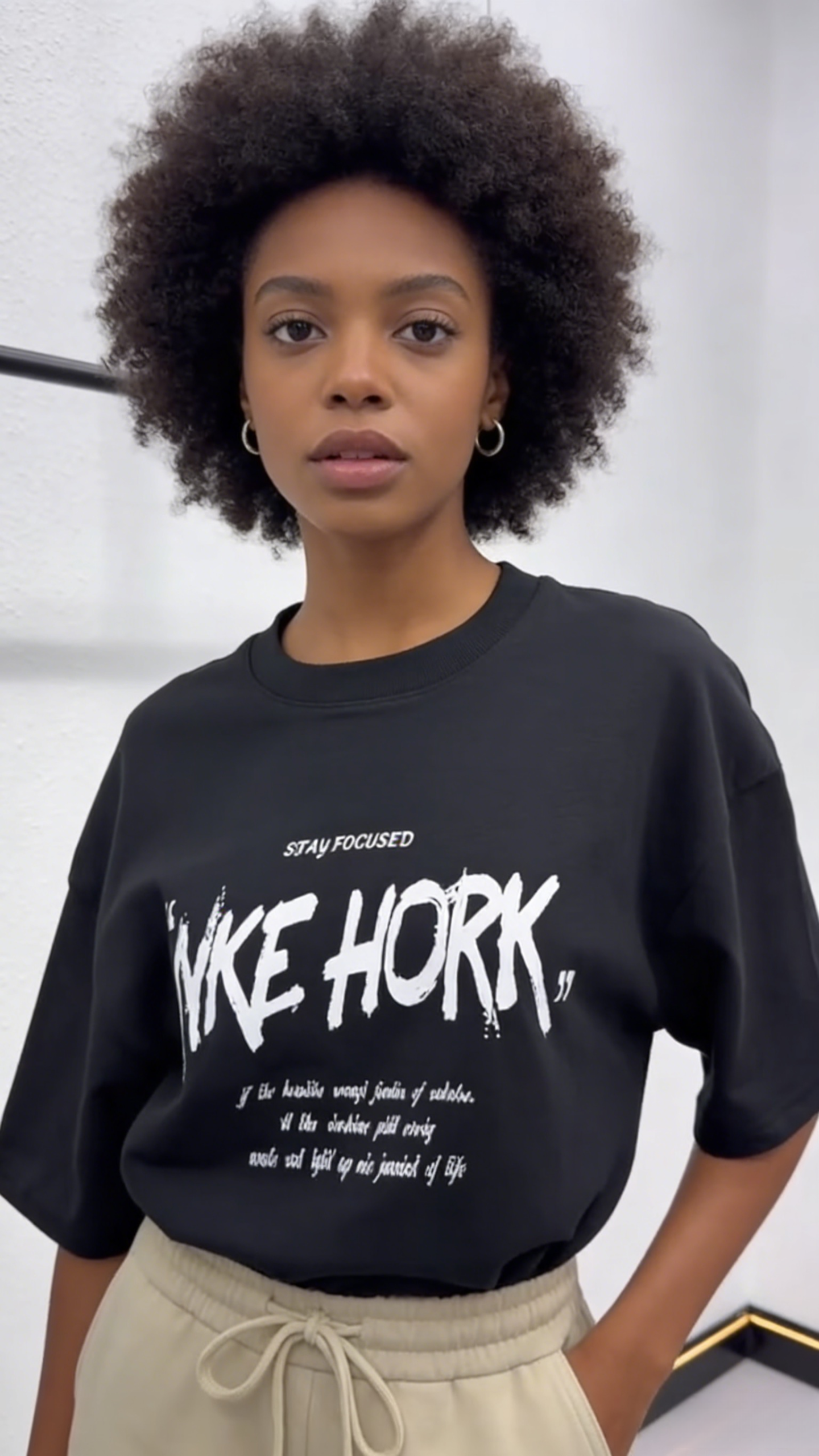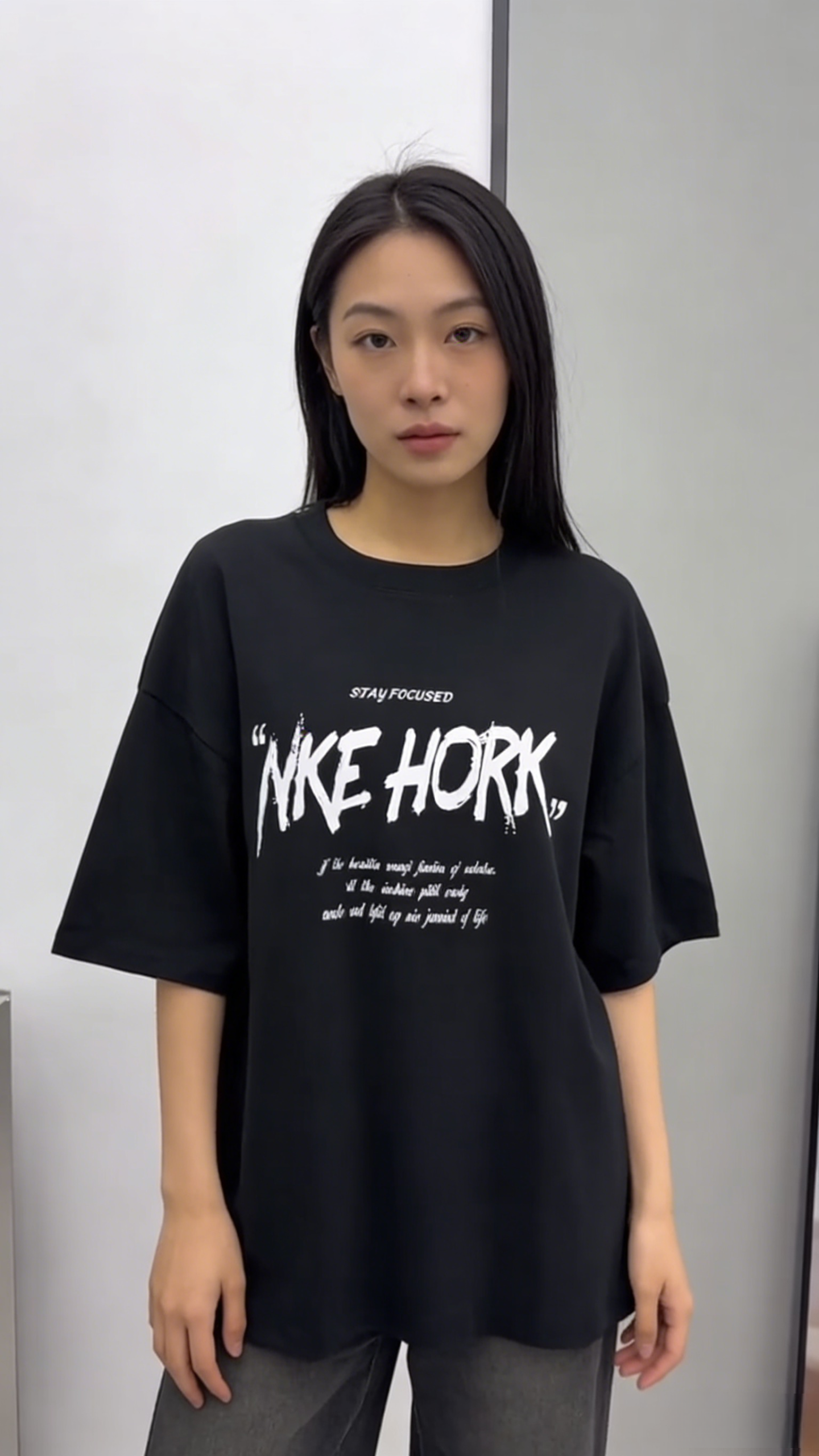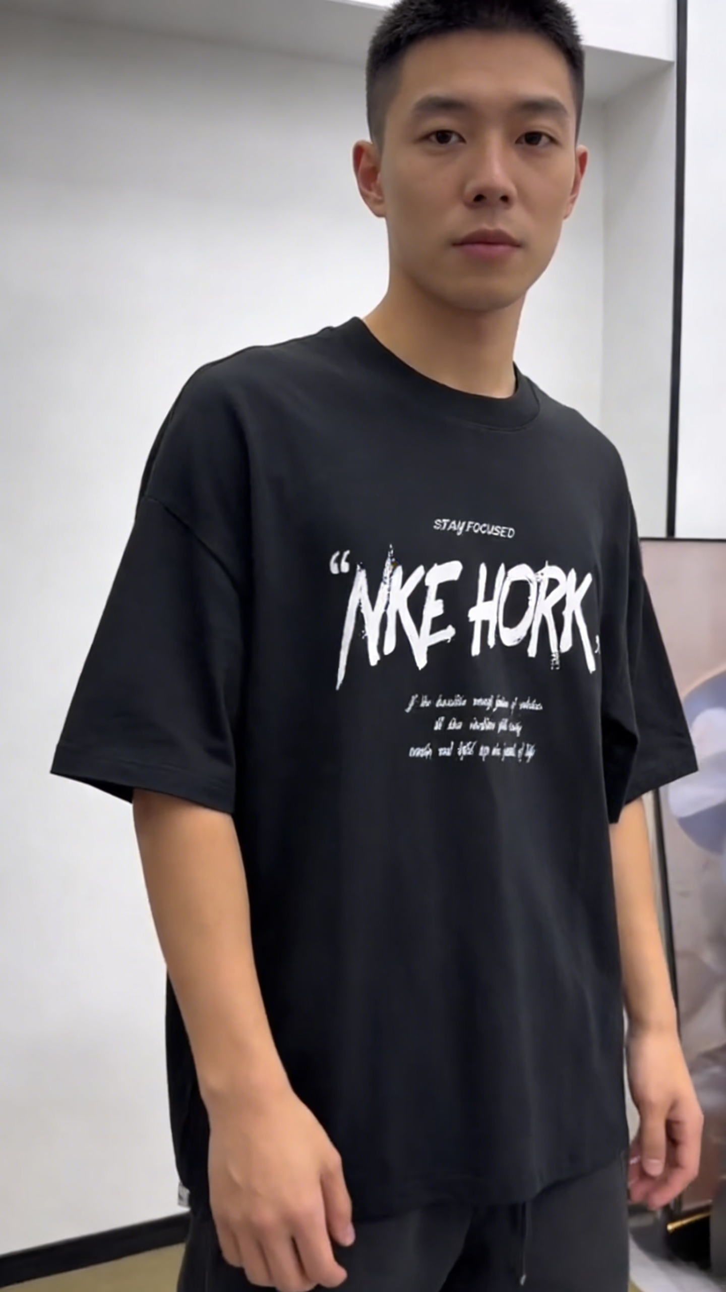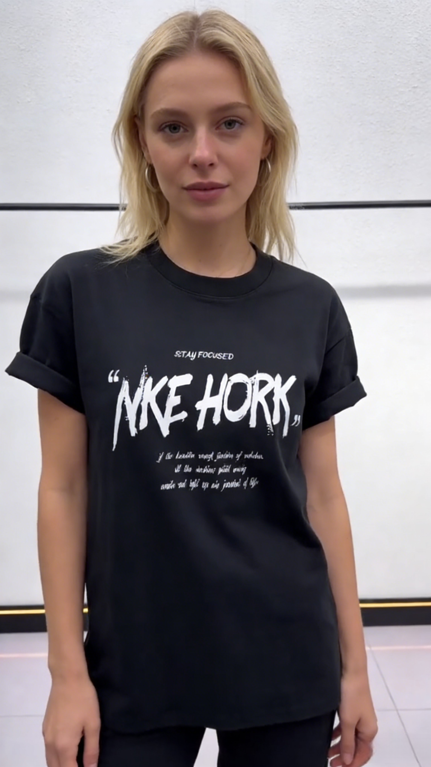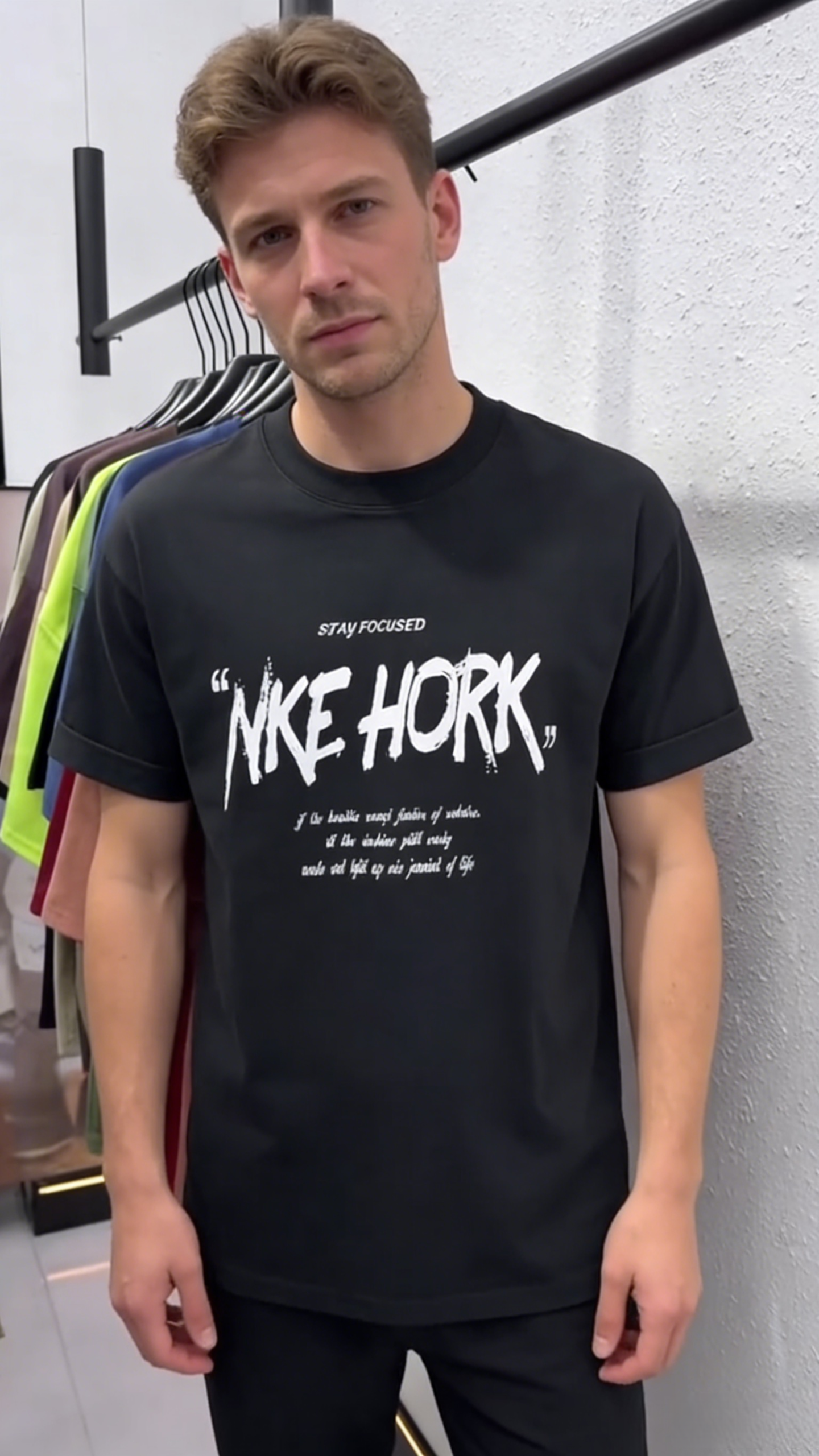 - Primary Keywords: 100% cotton T-shirt, oversized streetwear T-shirt, “NKE HORK” graphic tee, motivational quote shirt, wholesale cotton T-shirts