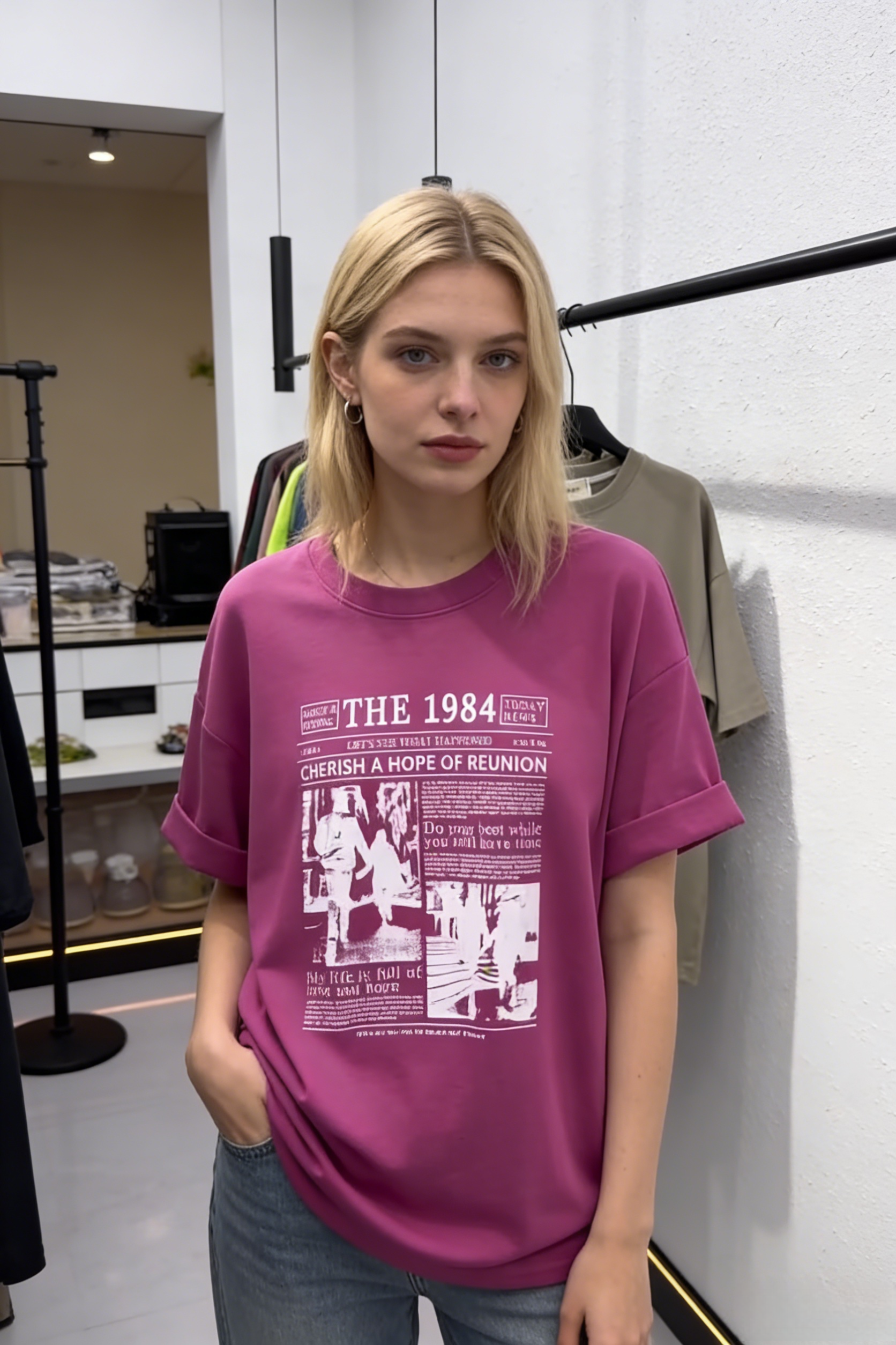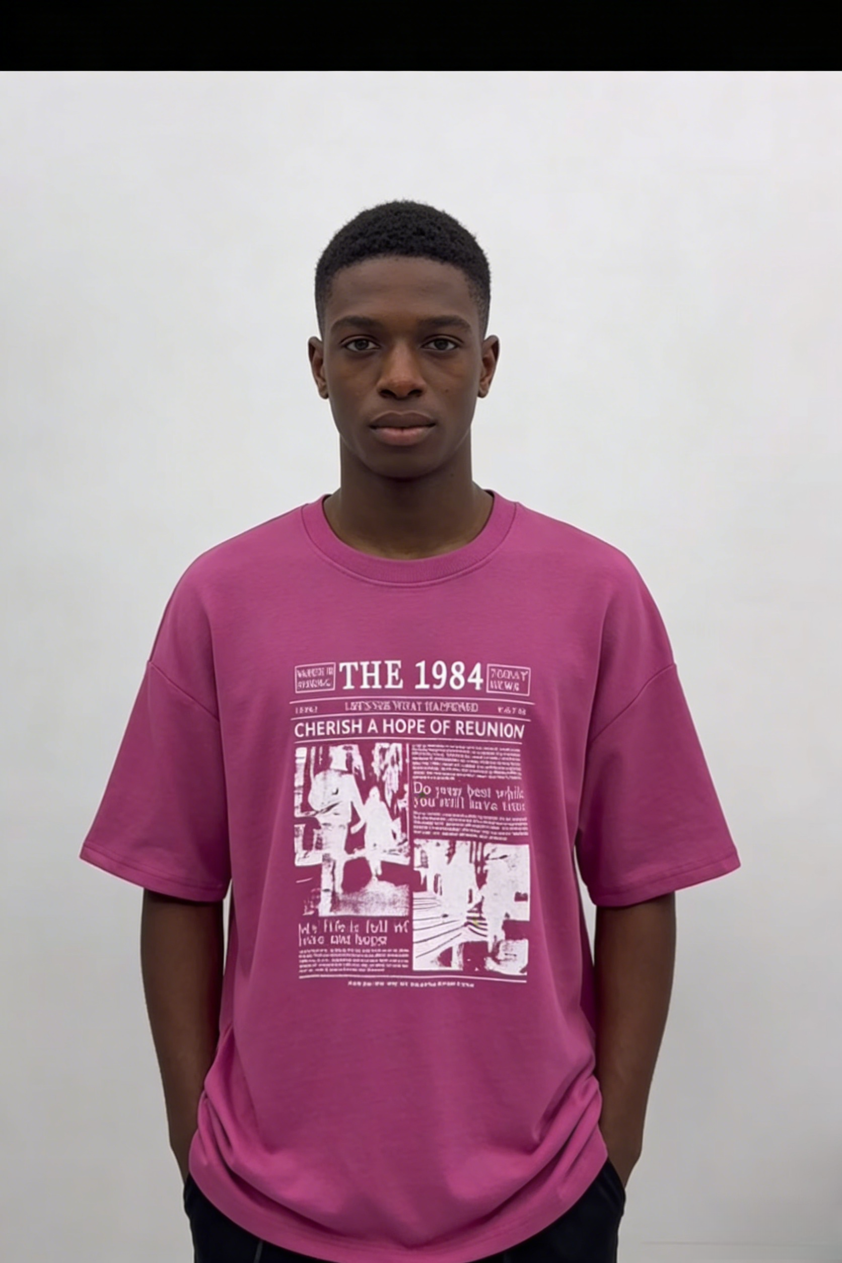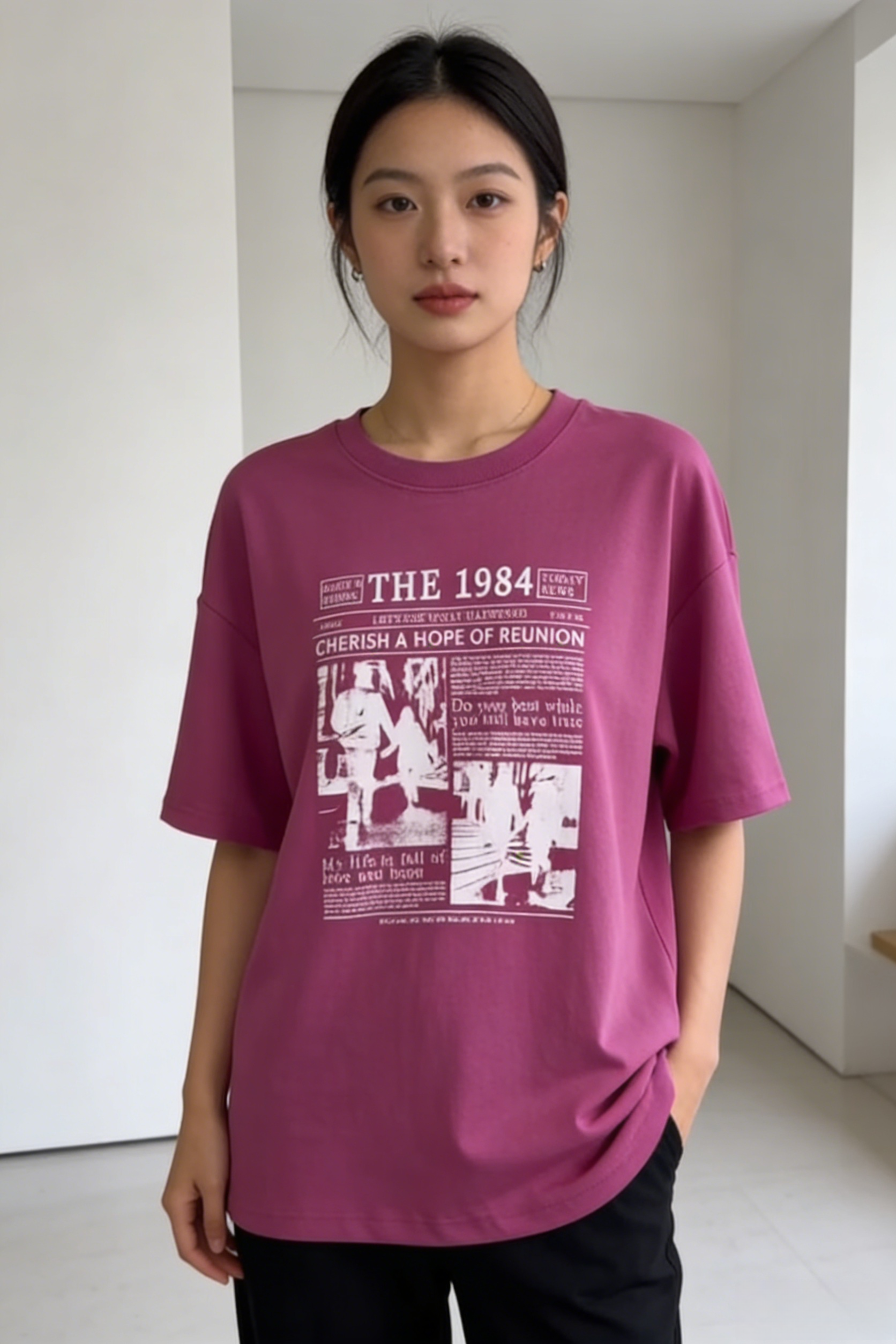 - Primary Keywords: 100% cotton T-shirt, oversized streetwear T-shirt, “THE 1984” graphic tee, vintage newspaper style shirt, wholesale cotton T-shirts
