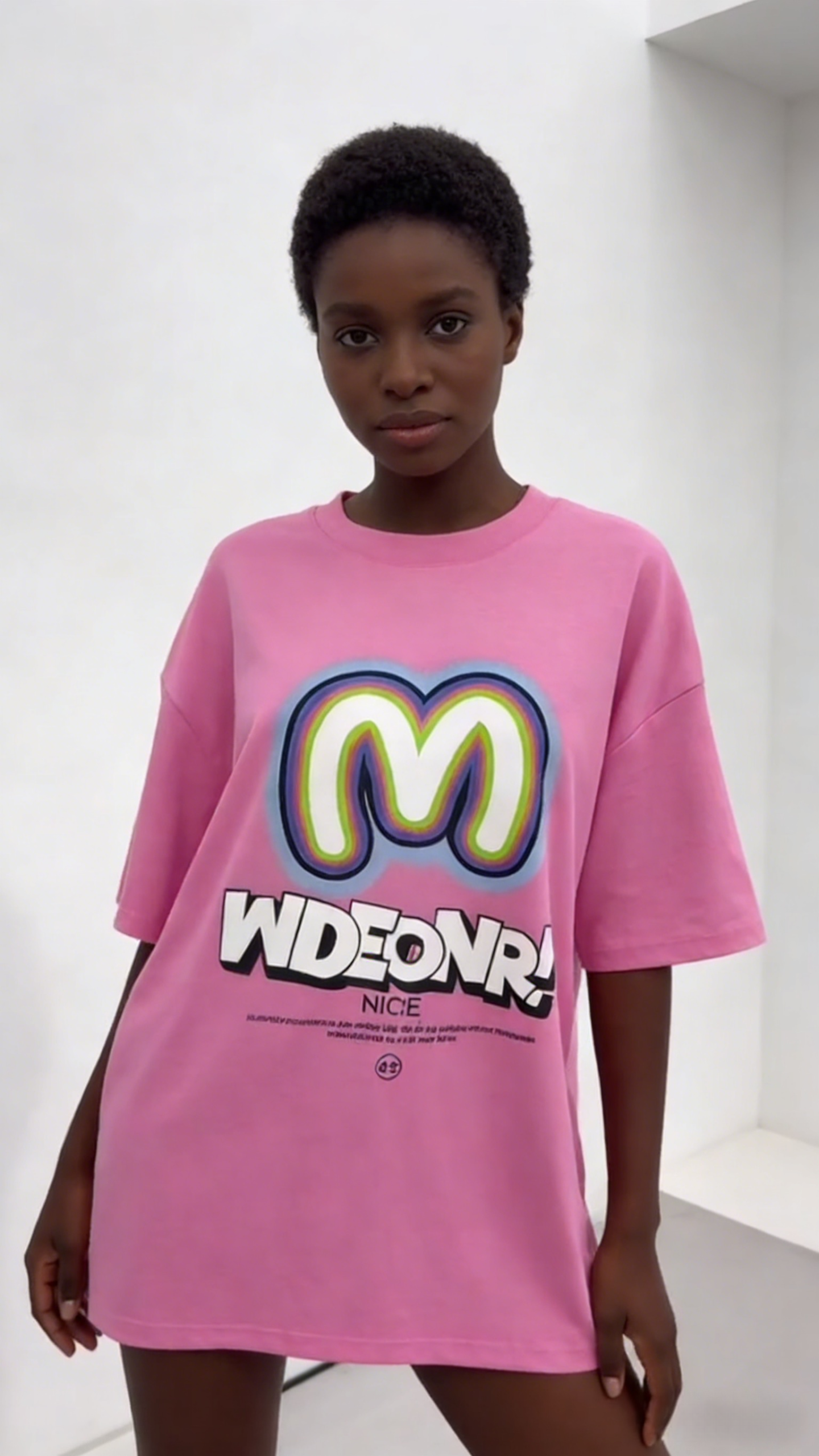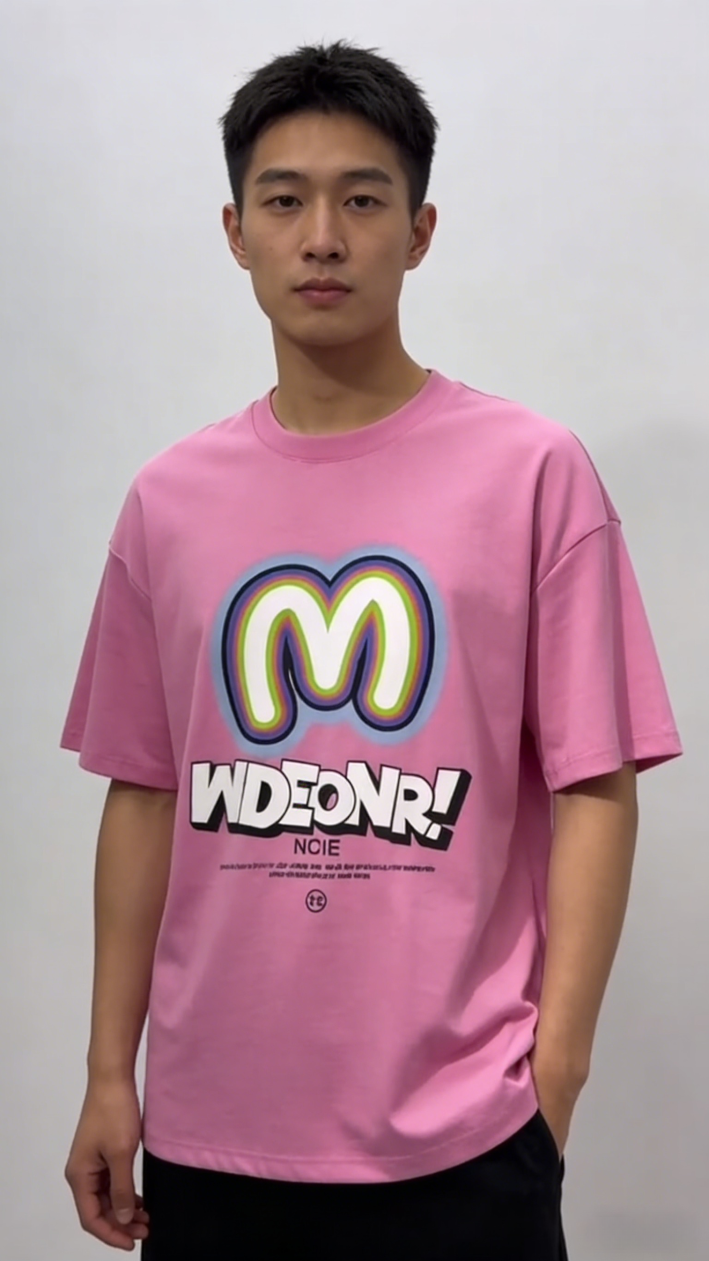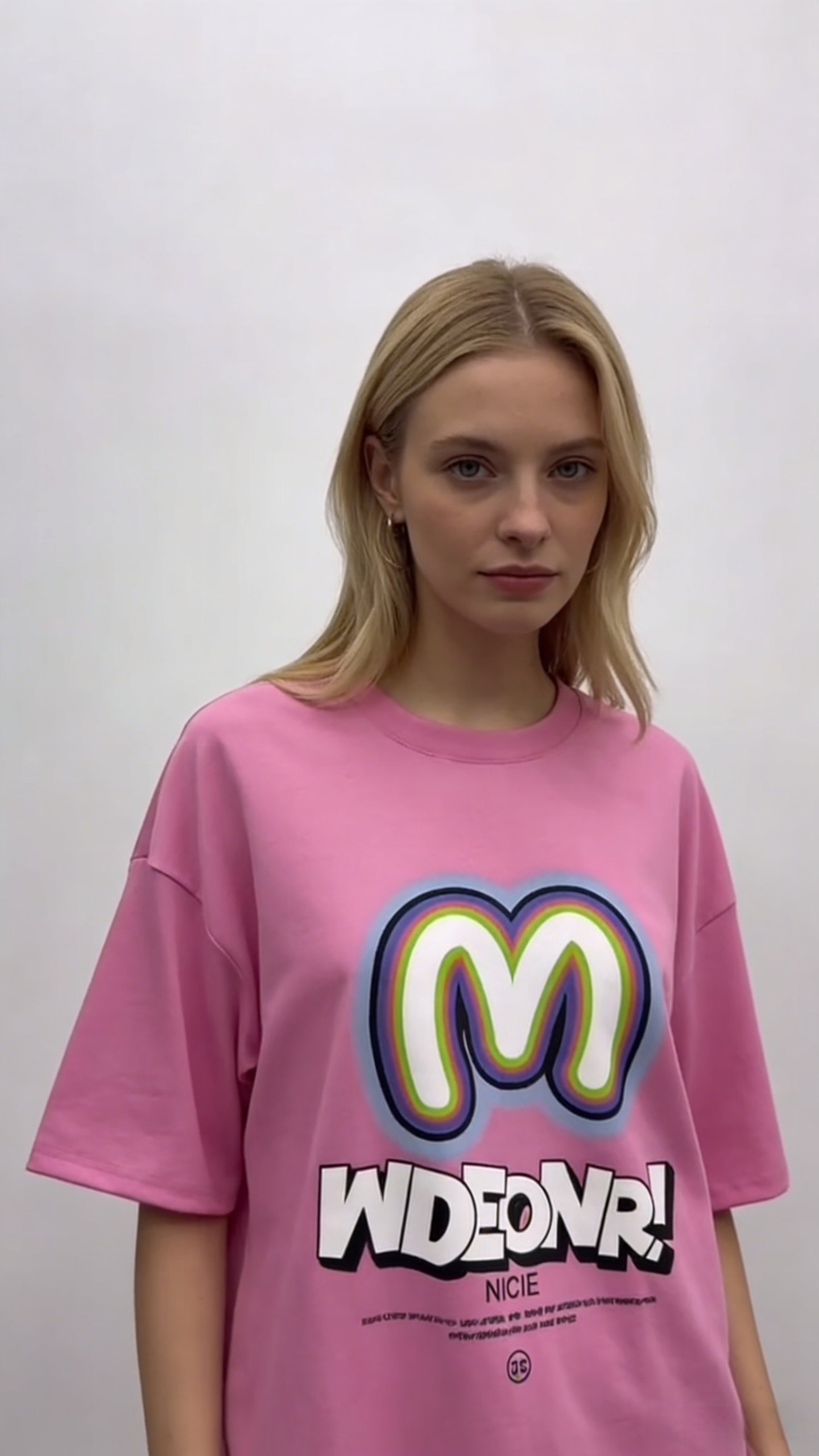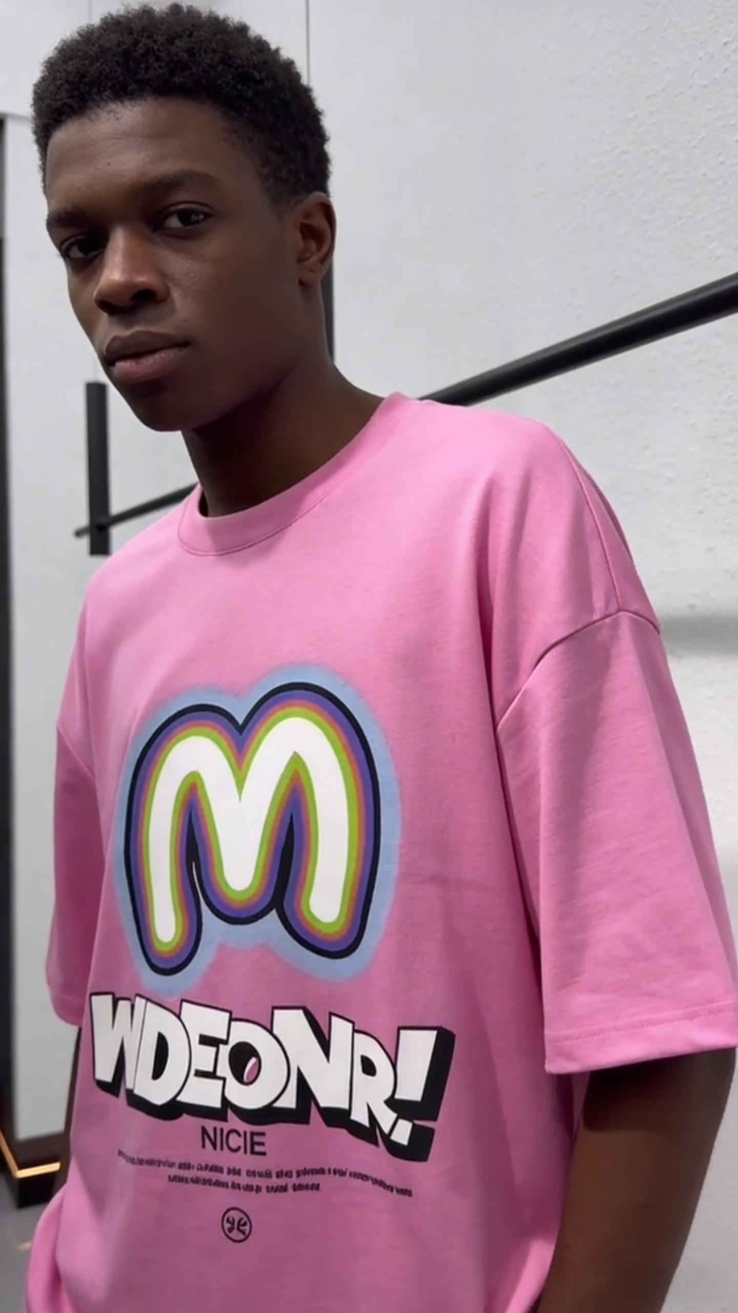 - Primary Keywords: 100% cotton T-shirt, oversized streetwear T-shirt, rainbow “M” graphic tee, “WDEONR!” text shirt, wholesale cotton T-shirts