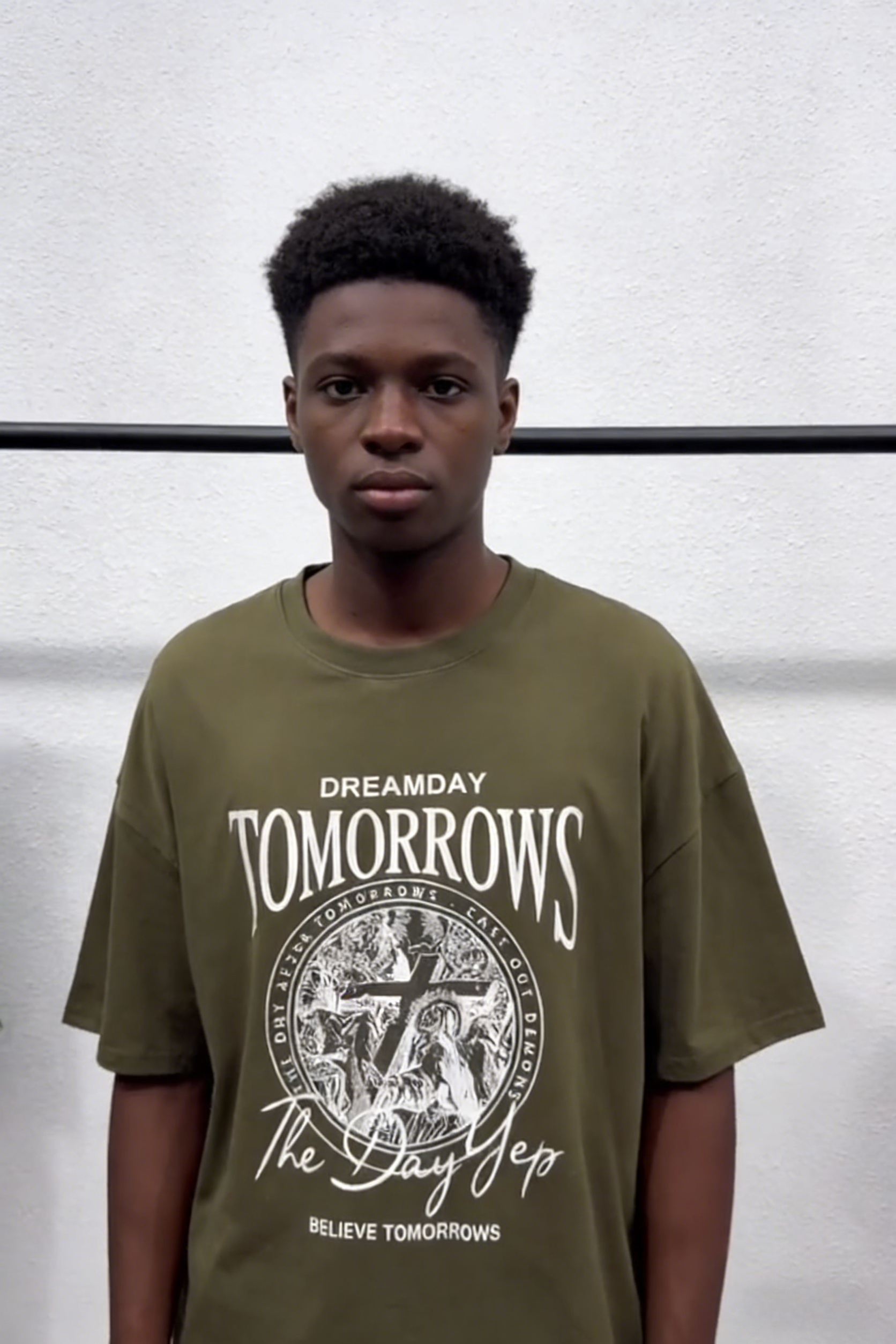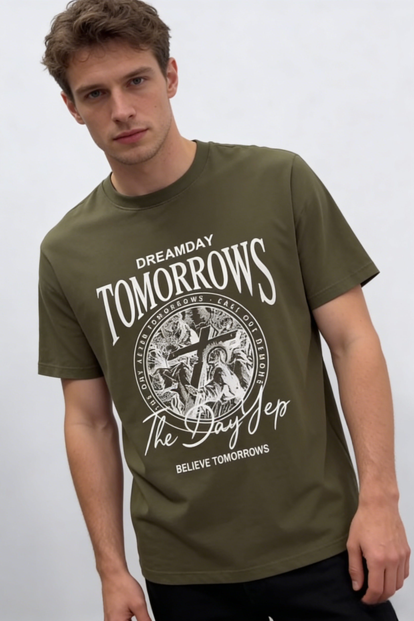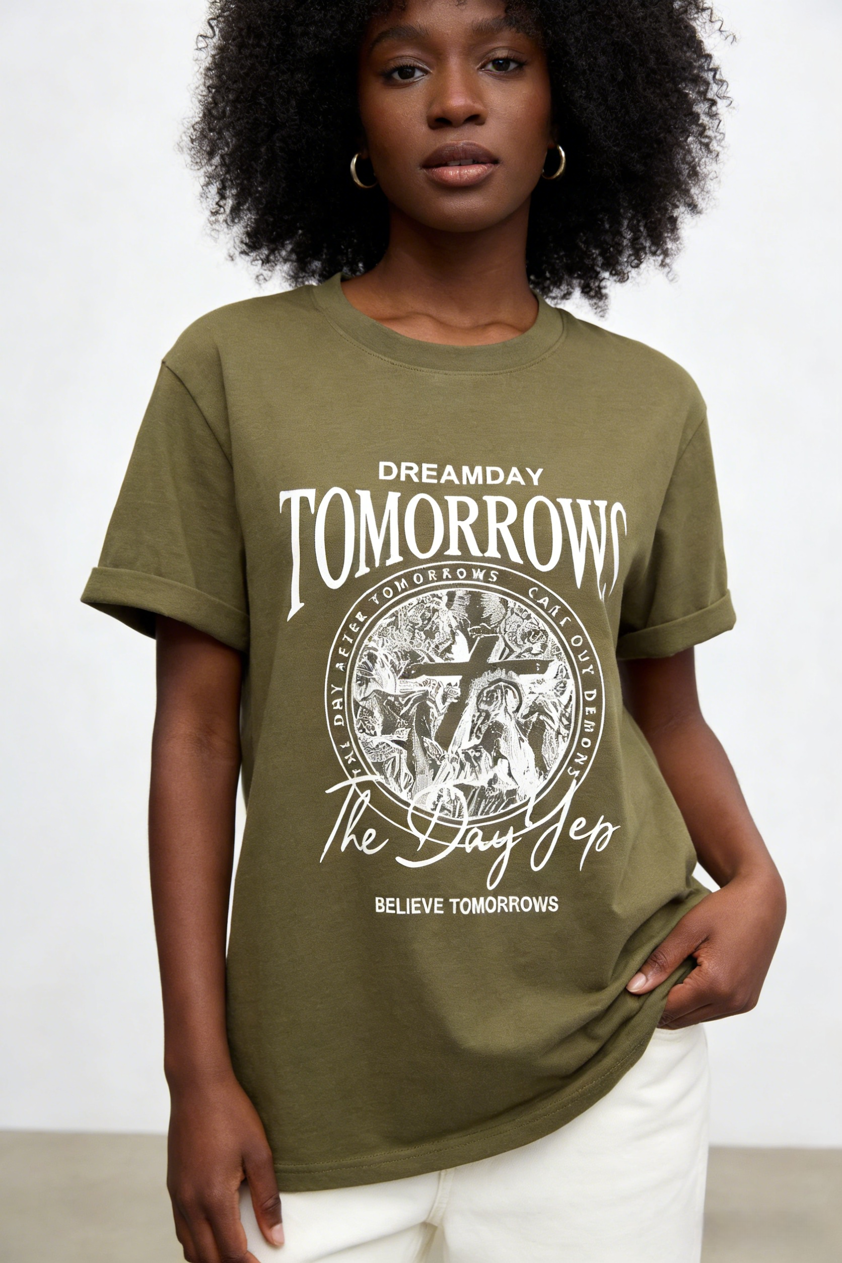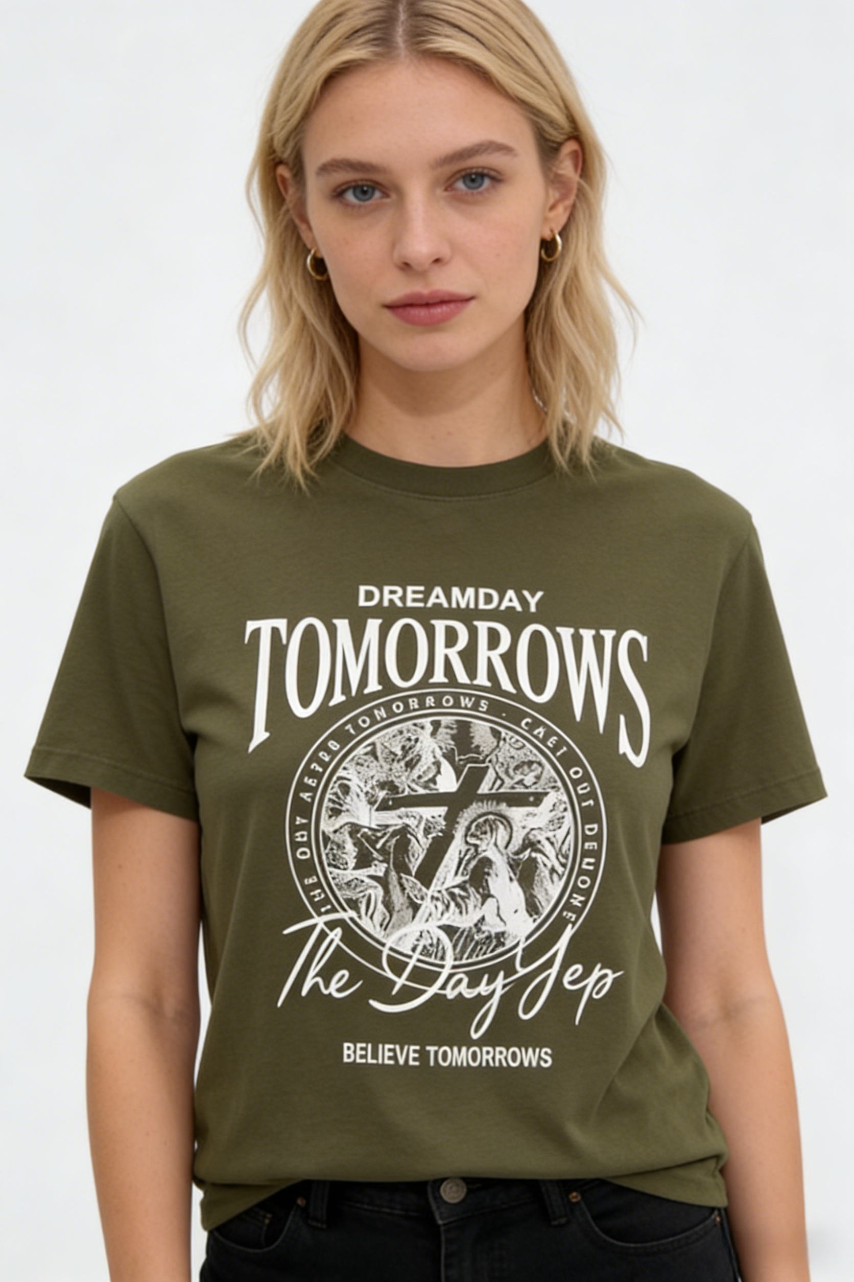 - Key Design Elements: Large “TOMORROWS” lettering at the top, paired with a circular cross-and-angel emblem, plus motivational text “DREAMDAY” and “BELIEVE TOMORROWS”, creating a nostalgic, edgy vibe.