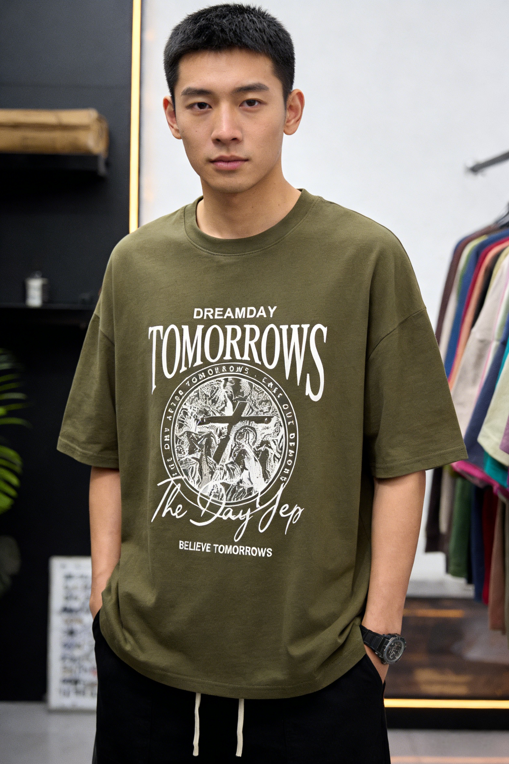 - Primary Keywords: 100% cotton T-shirt, oversized streetwear T-shirt, “DREAMDAY TOMORROWS” graphic tee, vintage cross emblem shirt, wholesale cotton T-shirts