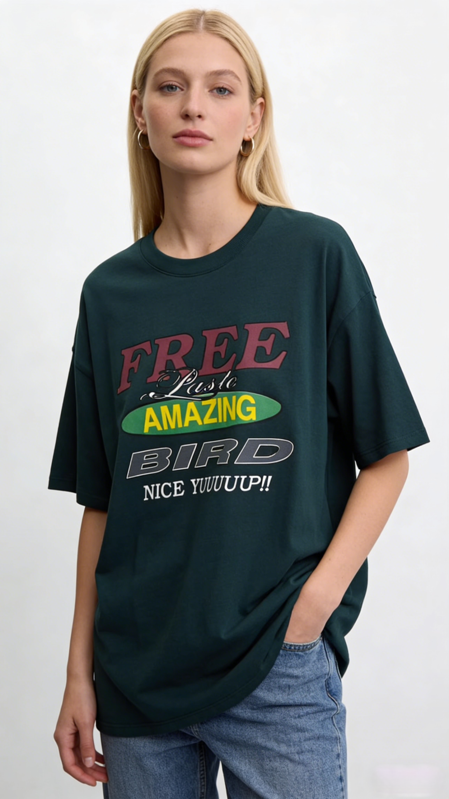 The front features a vintage-inspired multi-text graphic print with a bold, streetwear-style look: