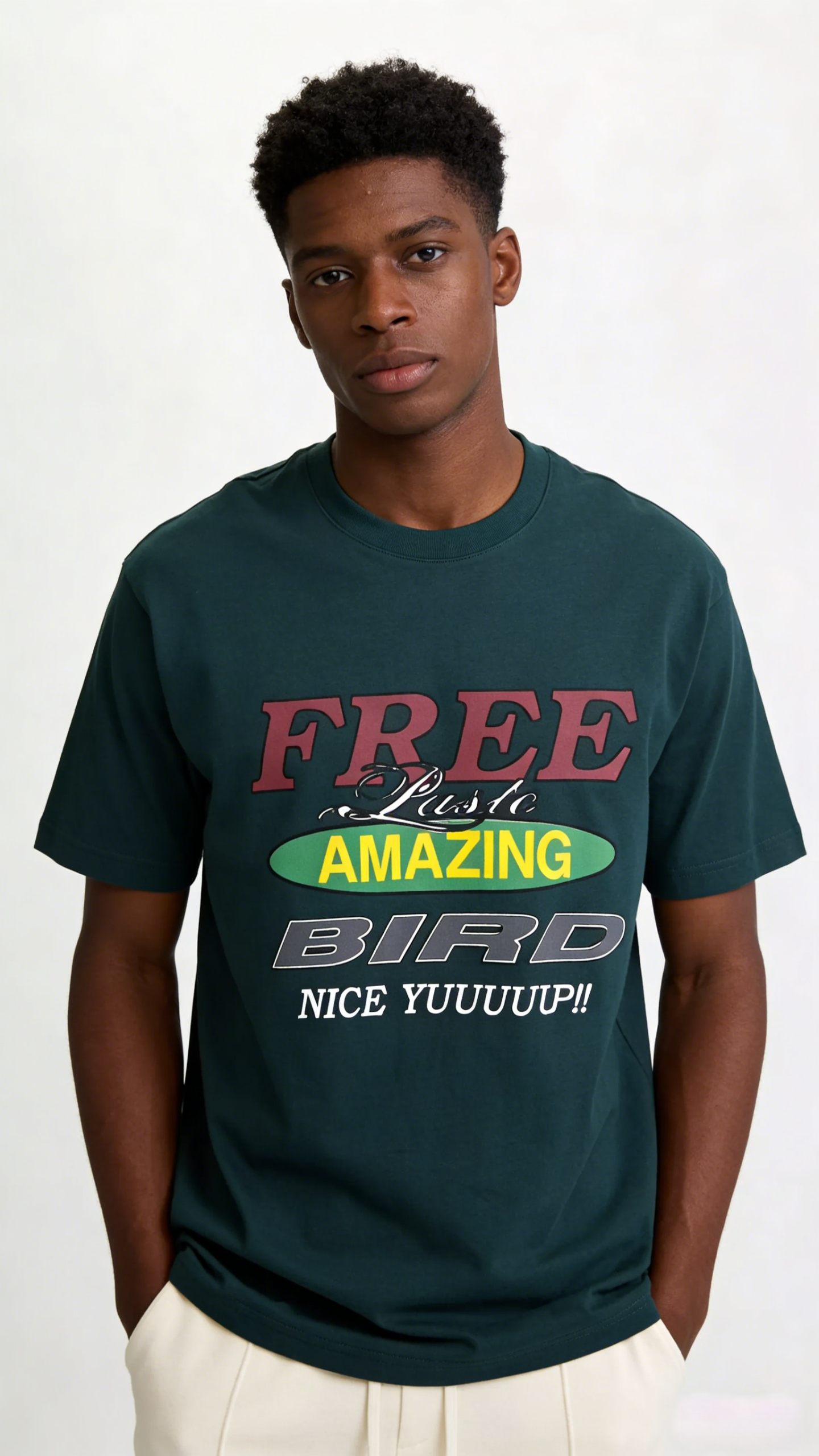 - Metallic silver “BIRD” and playful white “NICE YUUUUUP!!” at the bottom.