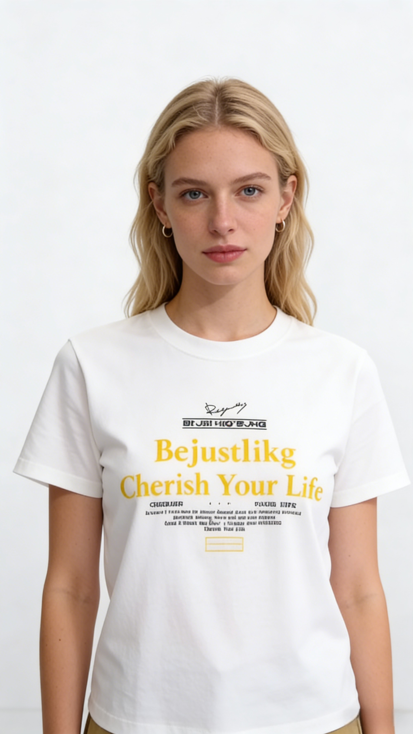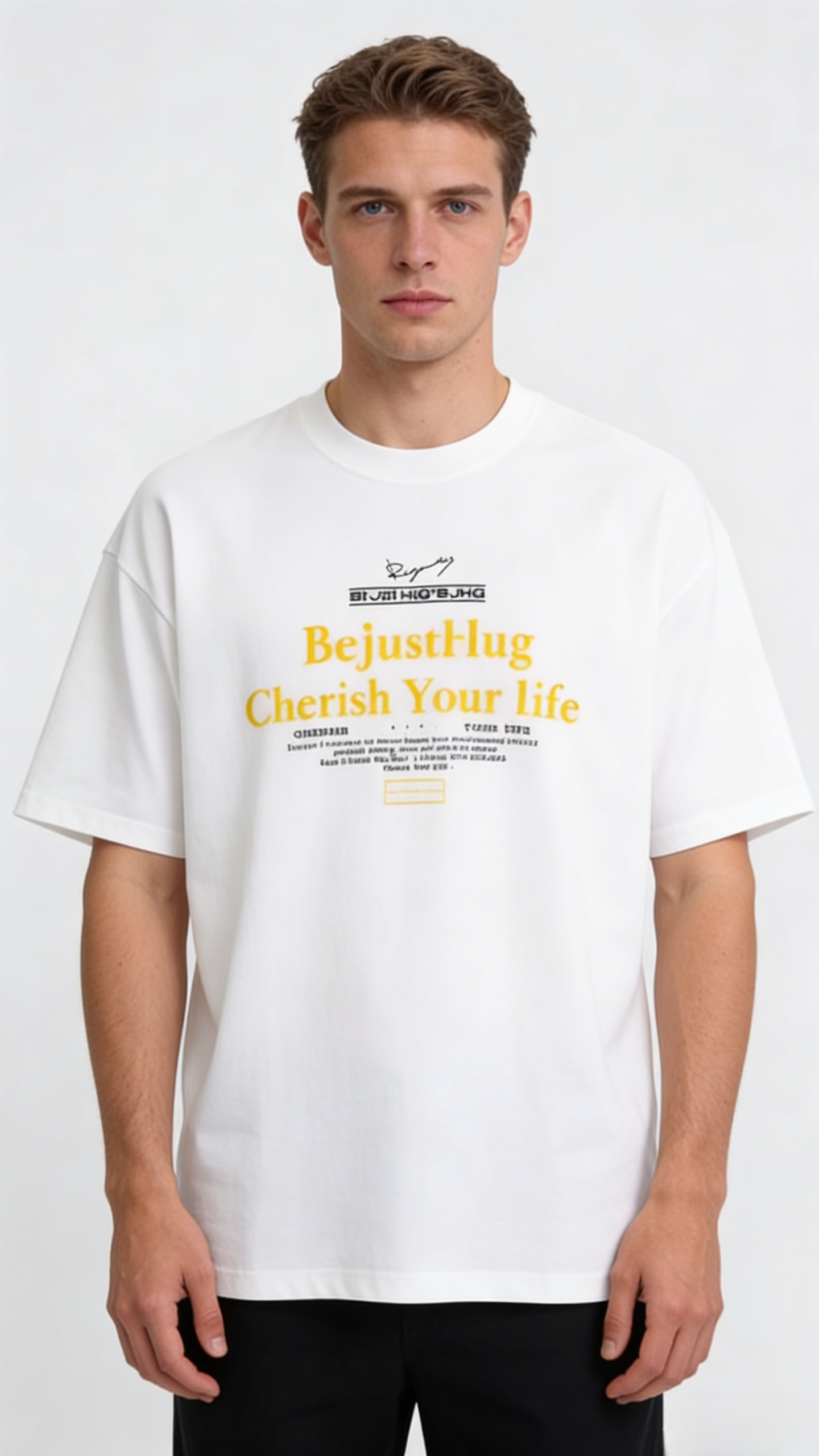 - Key Text: Bold yellow lettering reads “Bejustlikg Cherish Your Life” as the focal point, conveying a positive, life-affirming message.