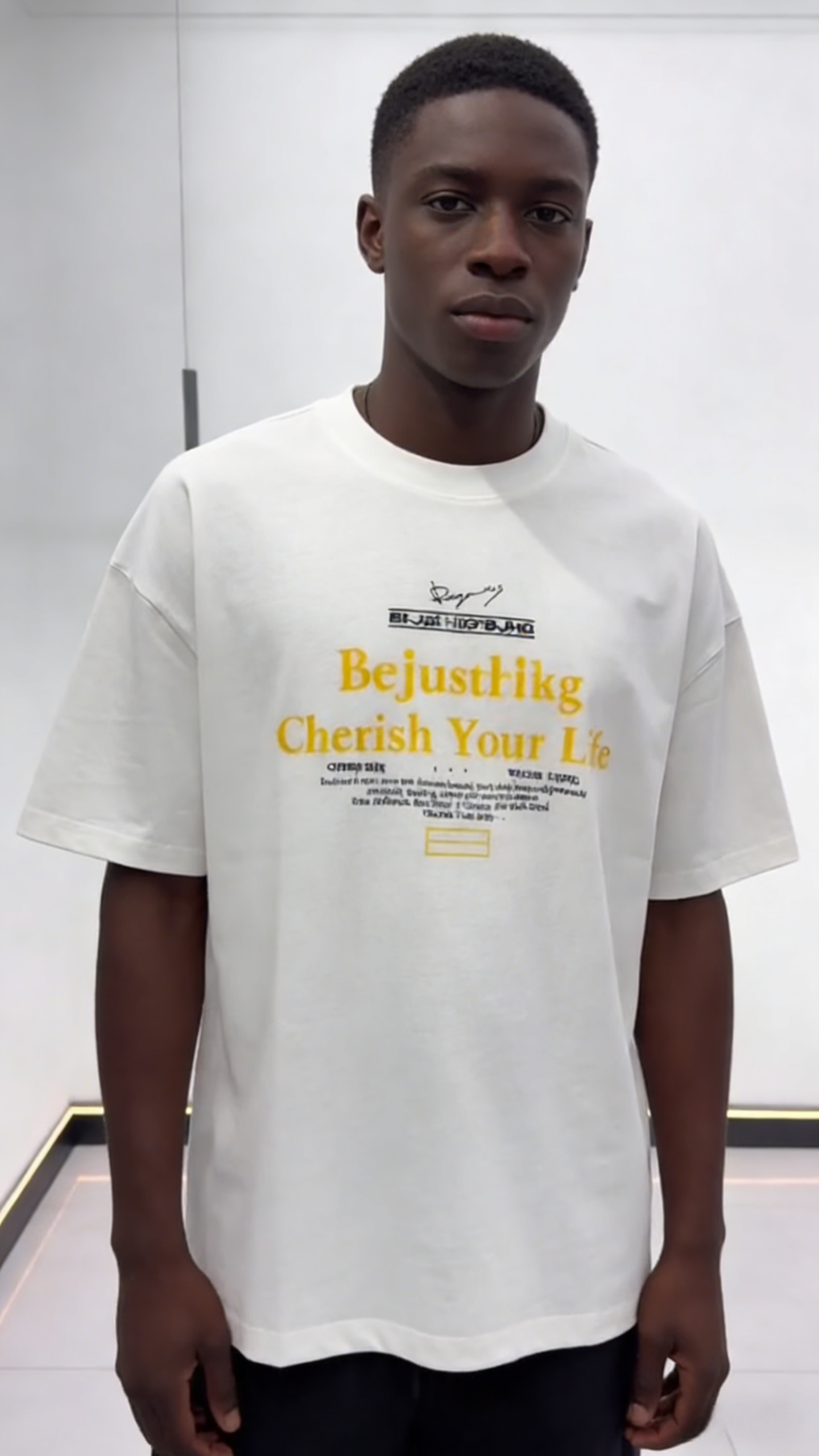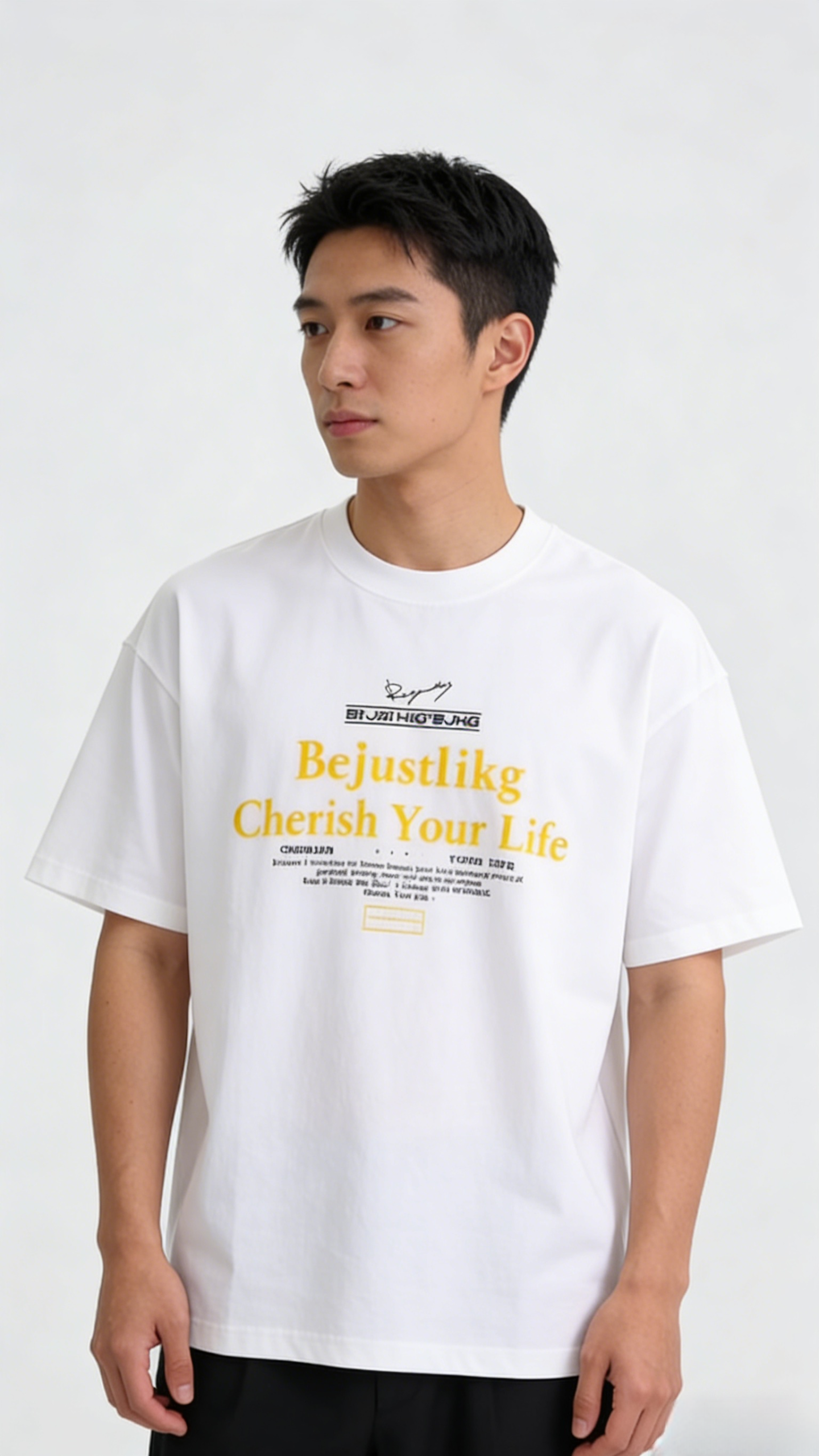 - Smaller black text (including stylized characters) creates visual depth and a streetwear-inspired look.
