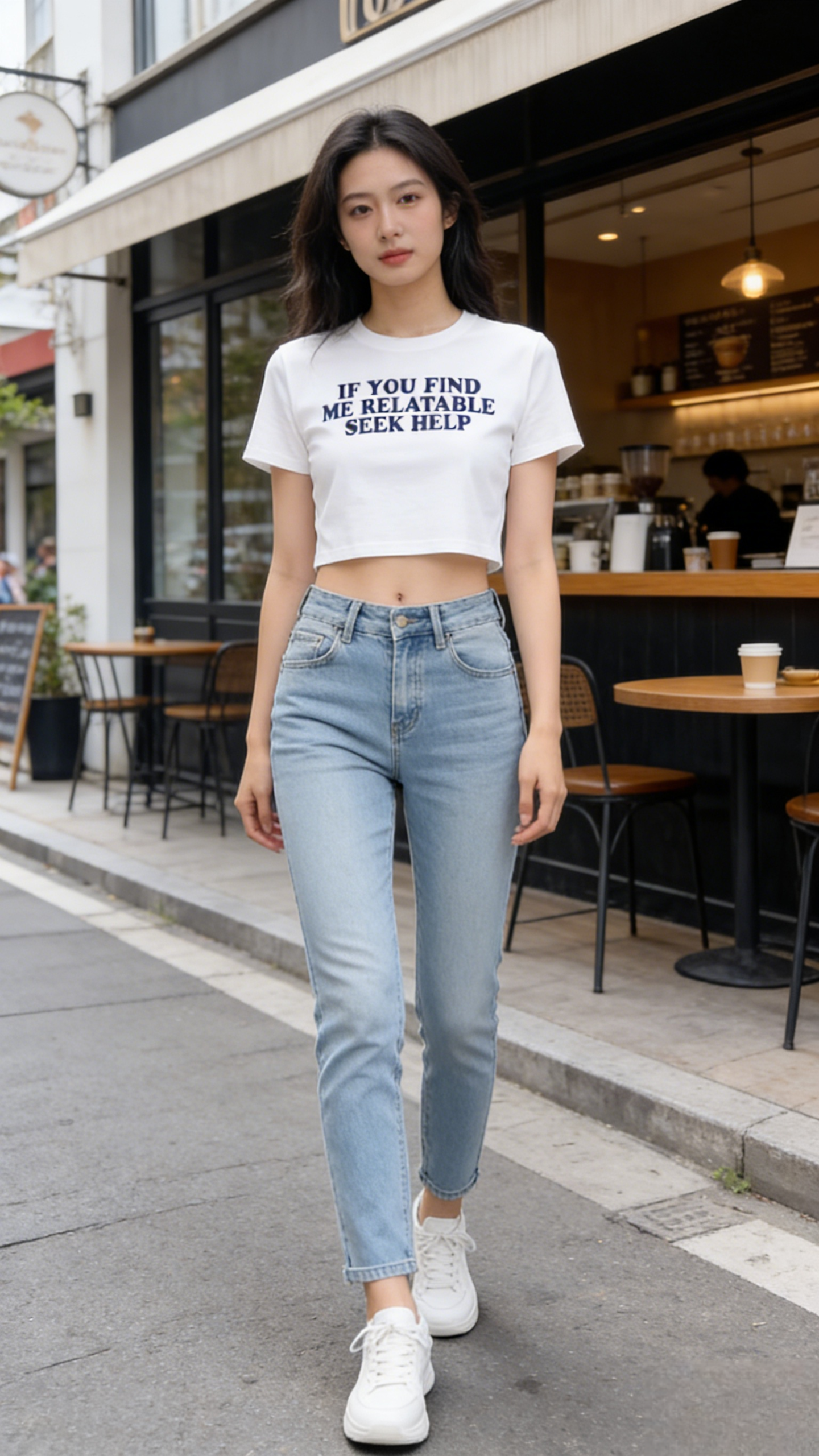 - Key Design Elements: White cropped base with a bold, blocky navy blue slogan printed across the chest, creating a sarcastic, attention-grabbing vibe.