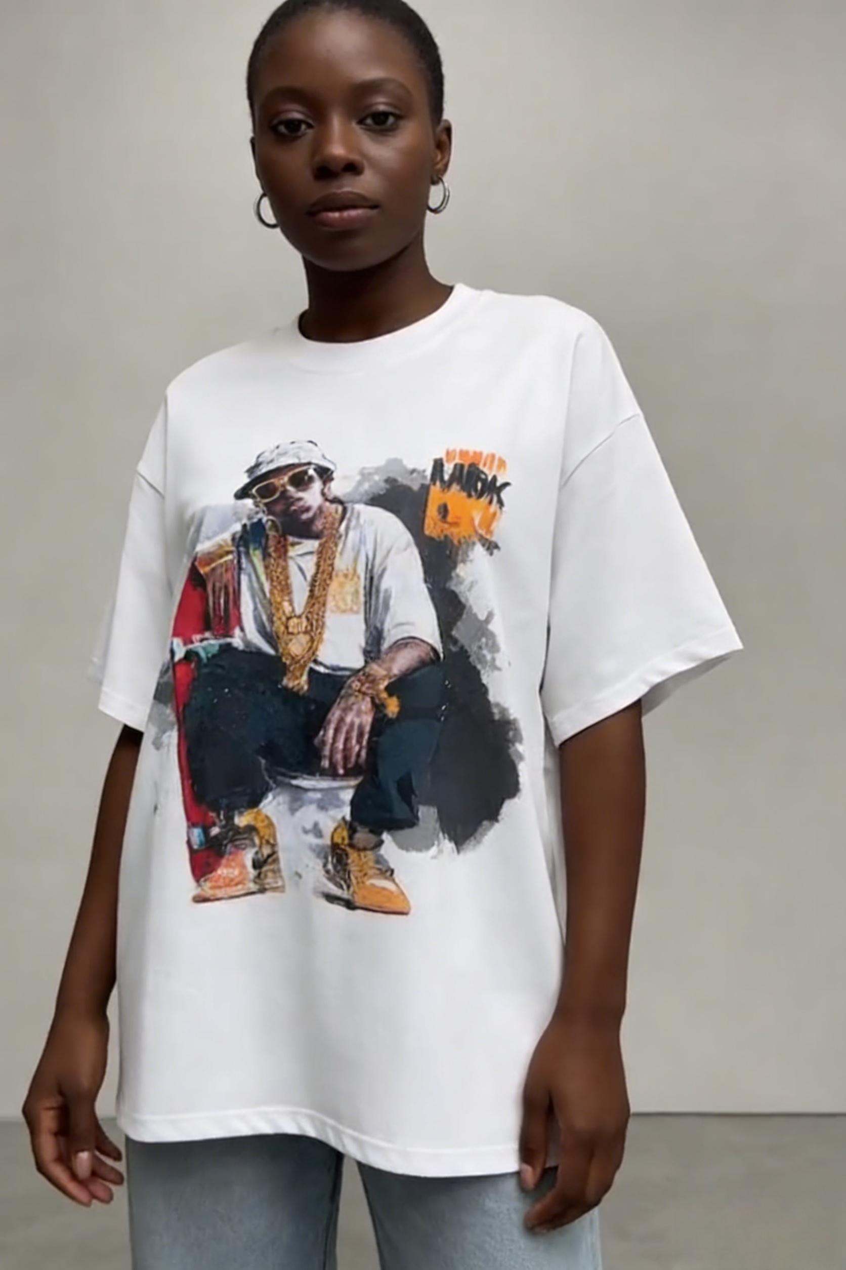 The front features a vintage hip-hop skate inspired graphic print with a bold, streetwise aesthetic: