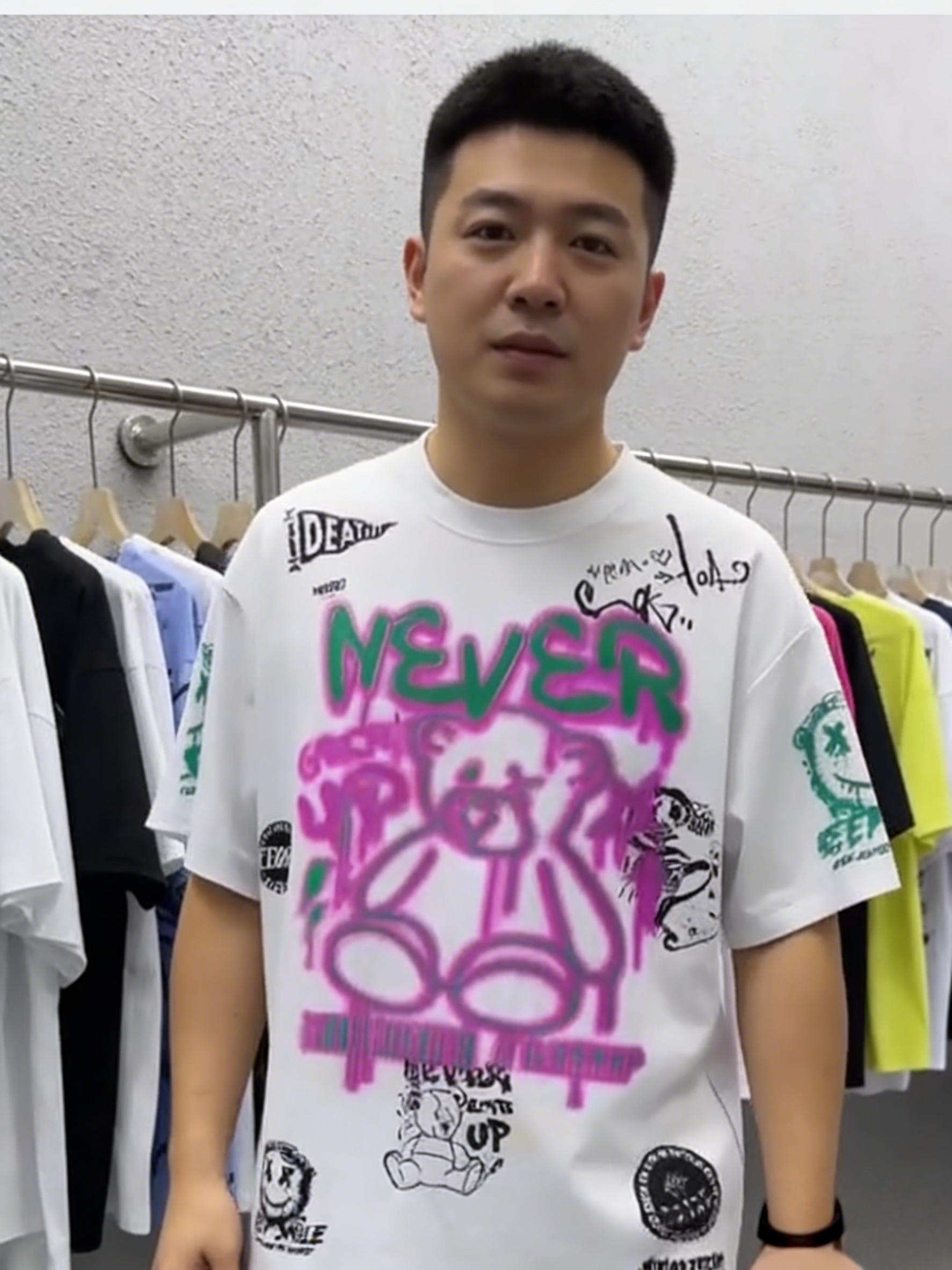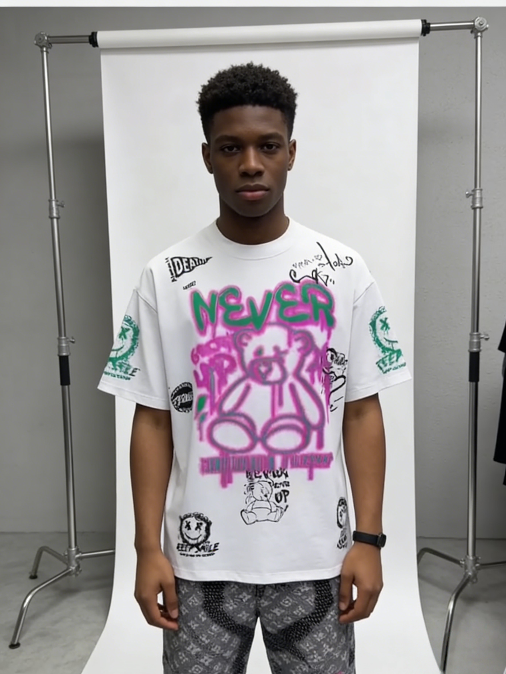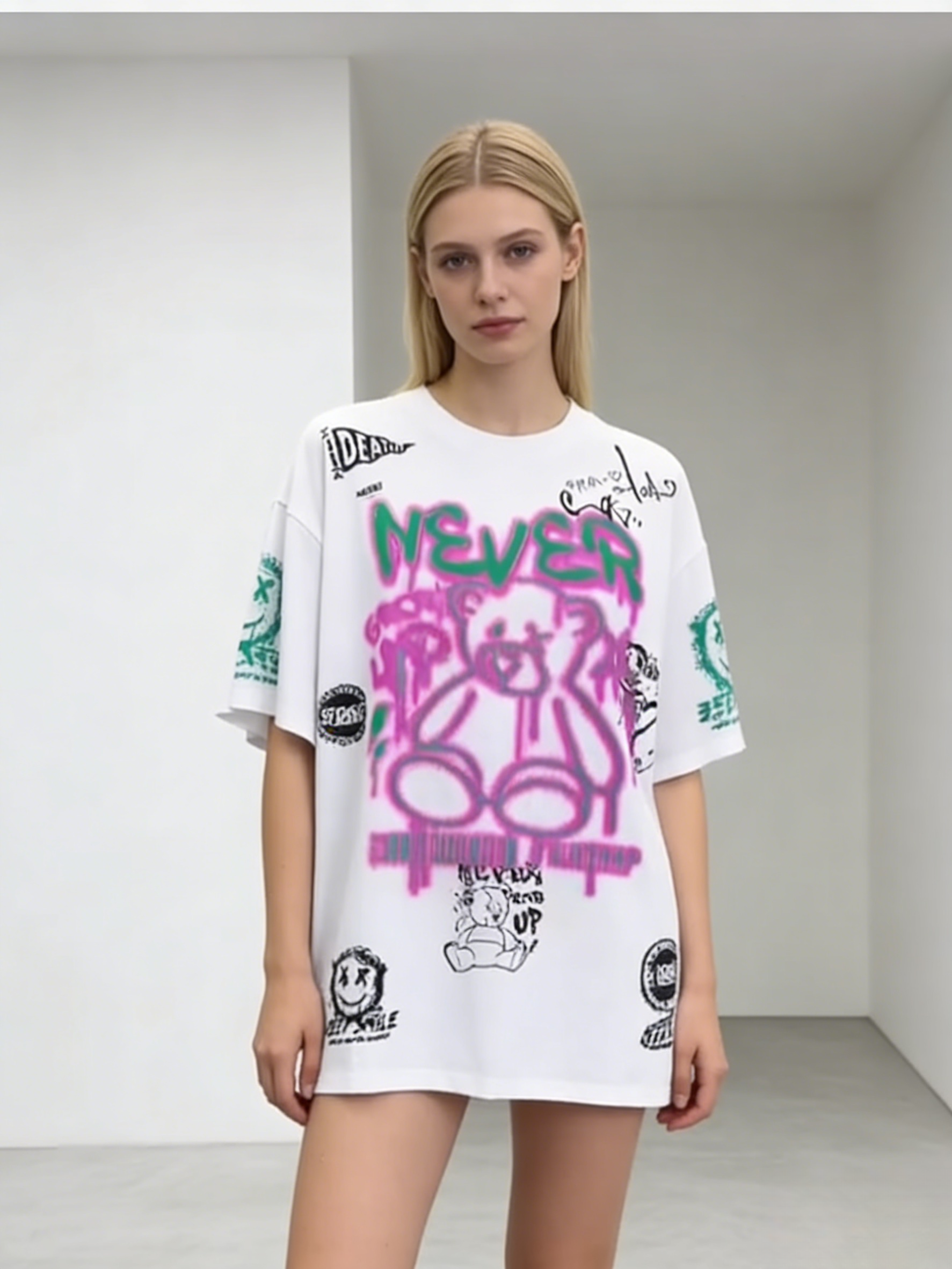 - Primary Keywords: 100% cotton T-shirt, oversized streetwear T-shirt, graffiti bear graphic tee, “NEVER” cotton shirt, wholesale cotton T-shirts