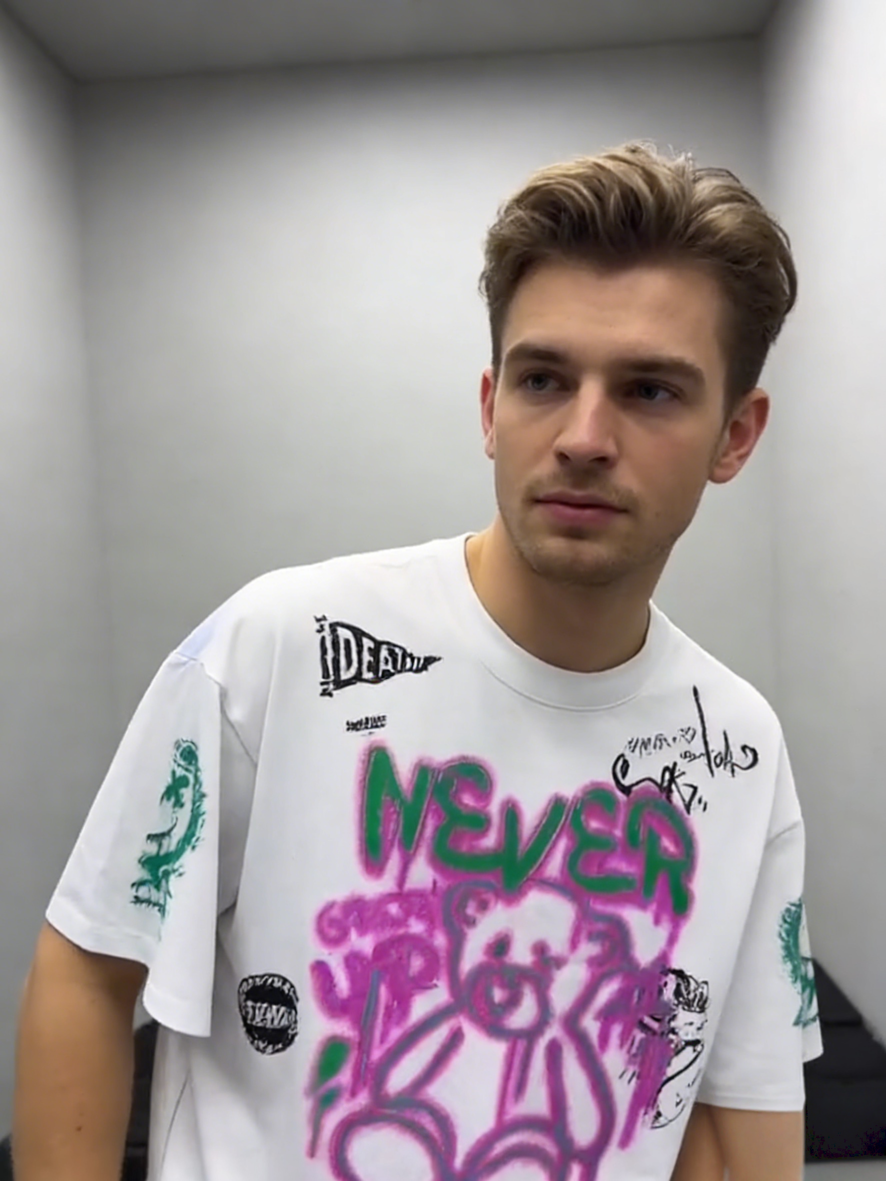 - Design: White base with pink graffiti bear + “NEVER” green text + scattered doodle graphics