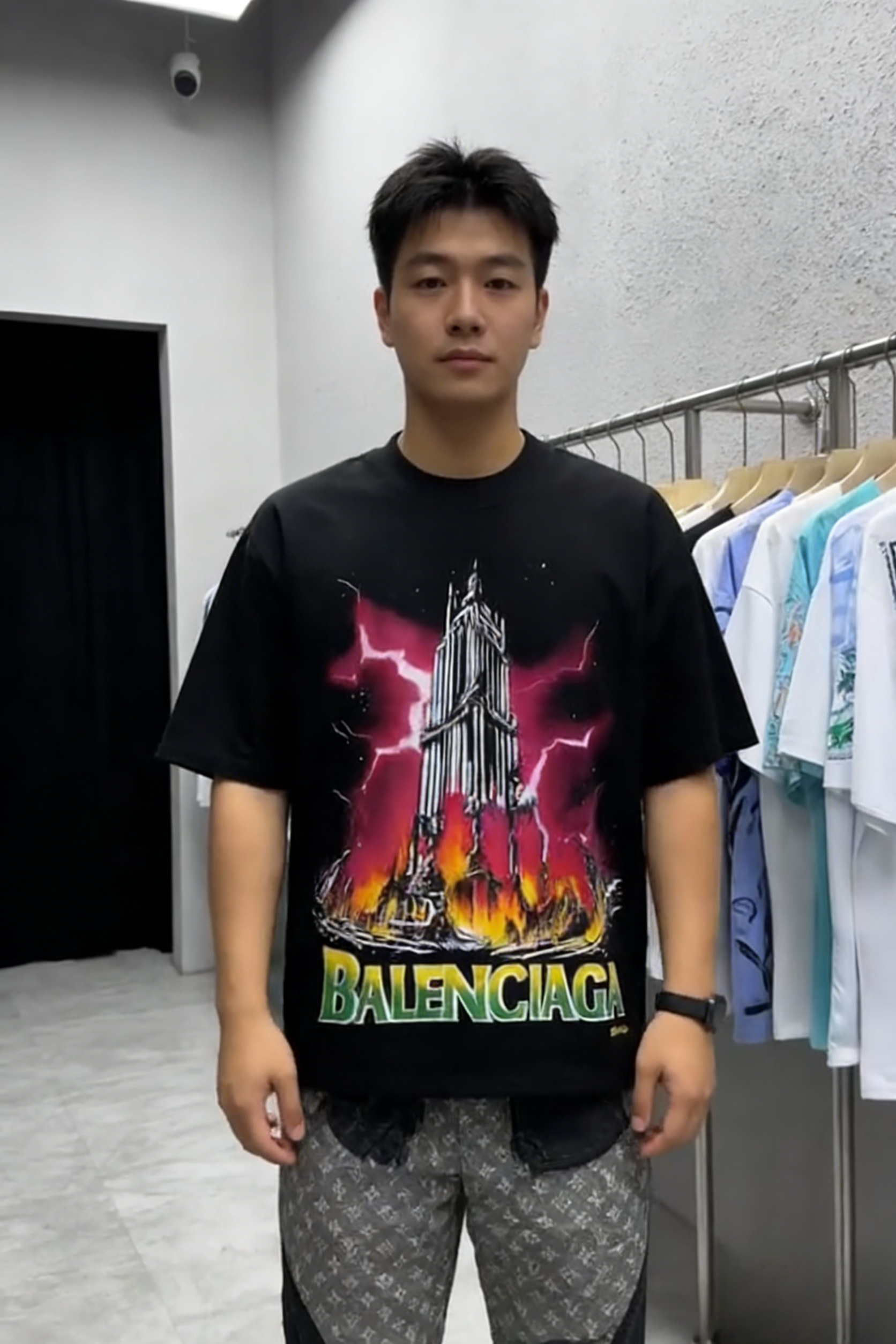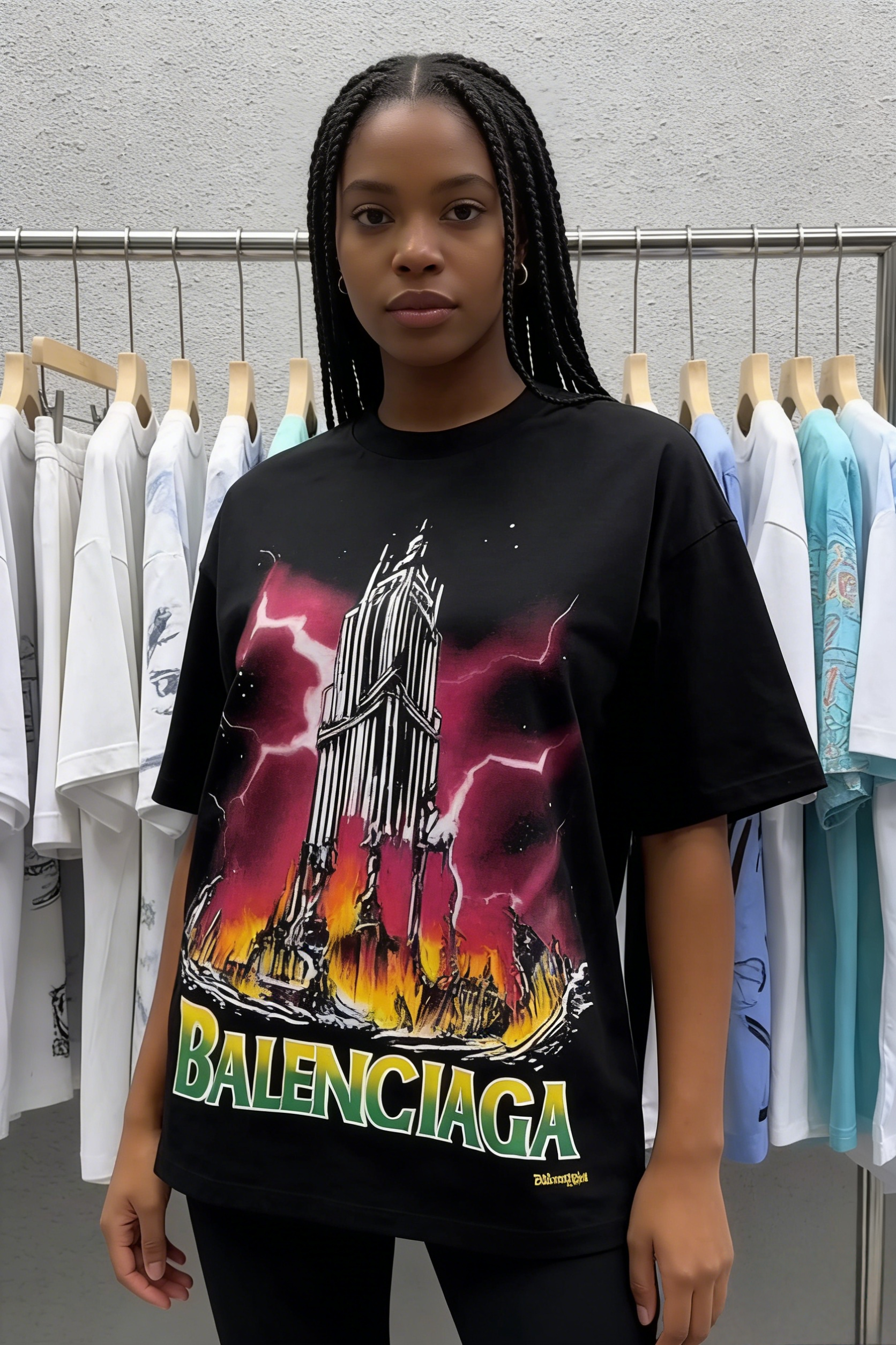 - Design: Black base with lightning tower graphic + gradient “BALENCIAGA” text
