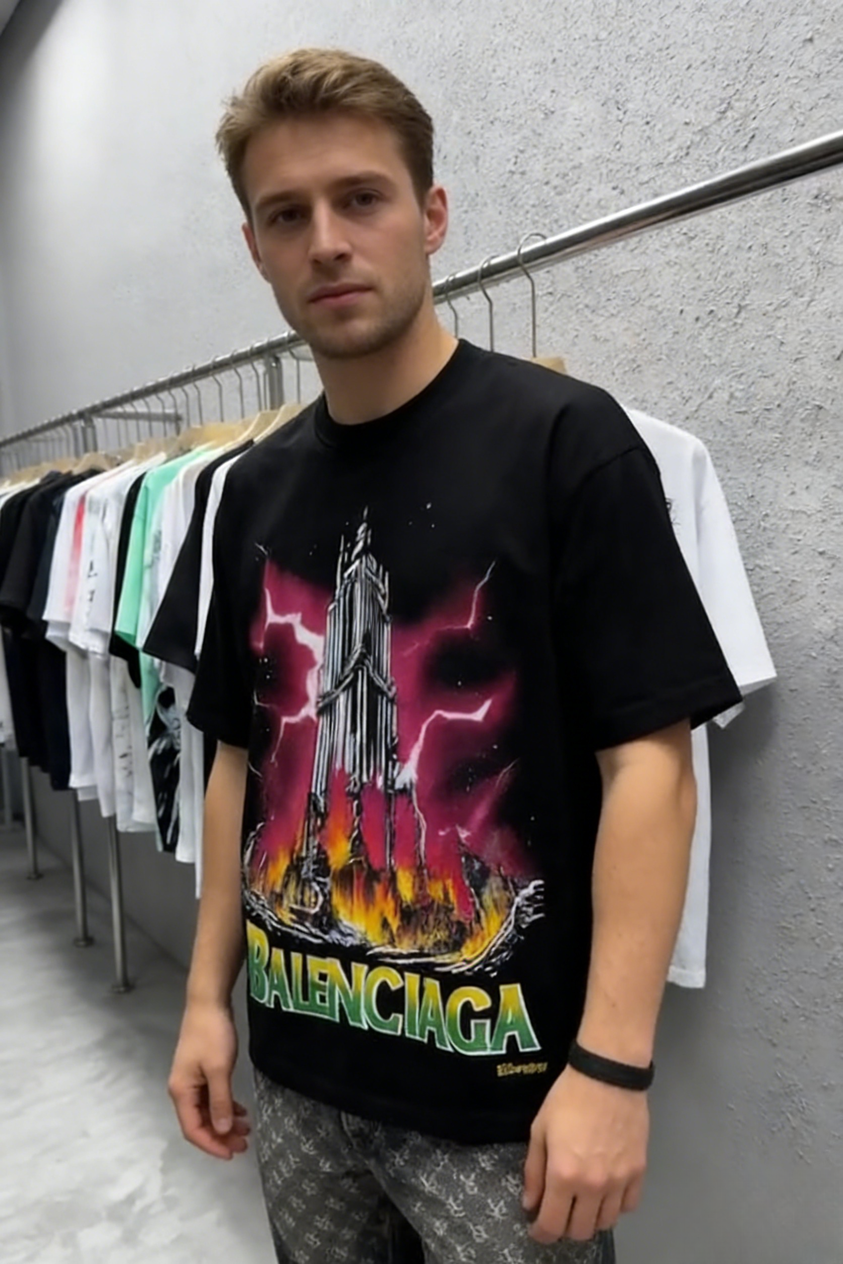 - Primary Keywords: 100% cotton T-shirt, oversized streetwear T-shirt, “BALENCIAGA” graphic tee, lightning tower cotton shirt, wholesale cotton T-shirts