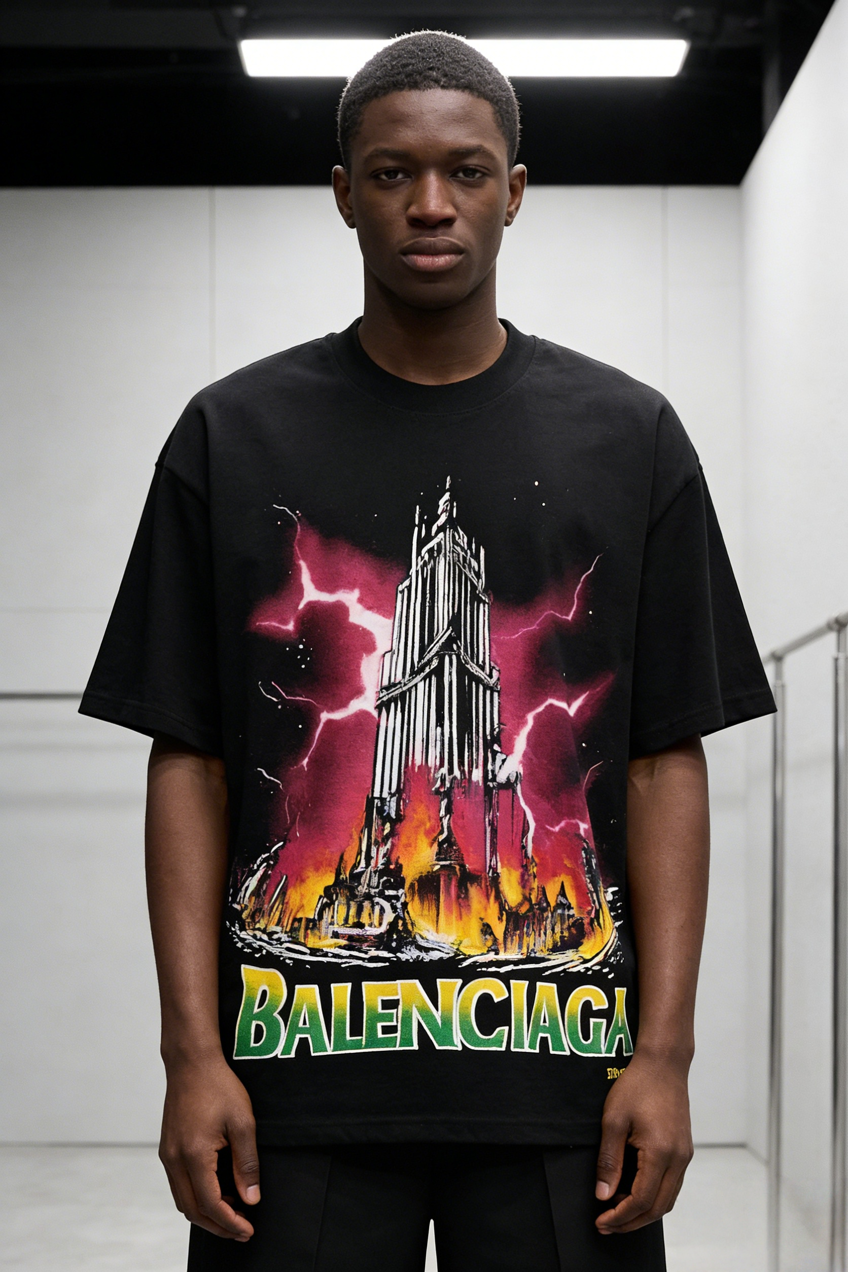 - Key Design Elements: Black base with a dramatic lightning tower graphic (white skeletal tower + pink/orange lightning/fire effects), paired with gradient green-yellow “BALENCIAGA” lettering at the bottom, creating a futuristic streetwear vibe.