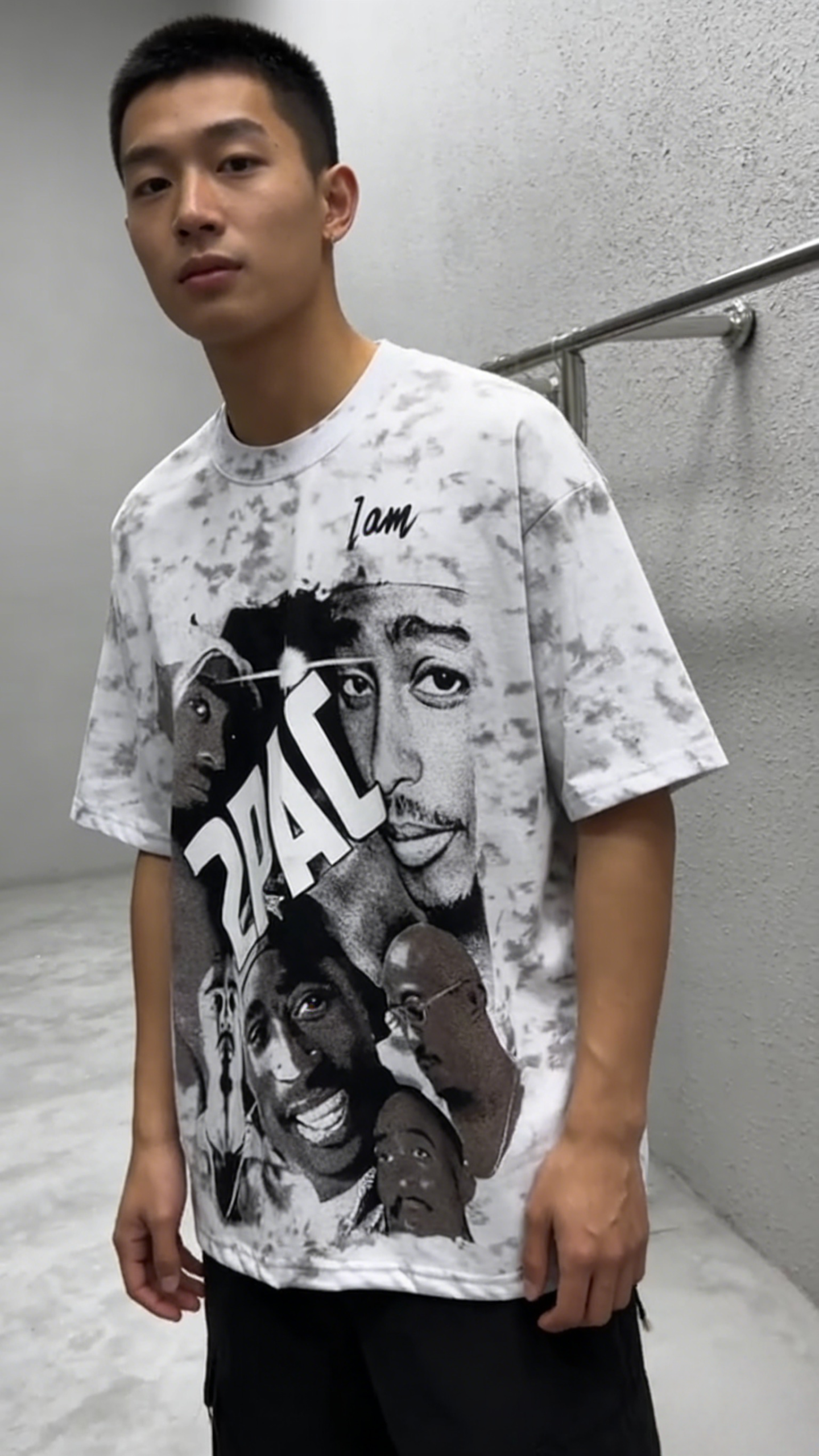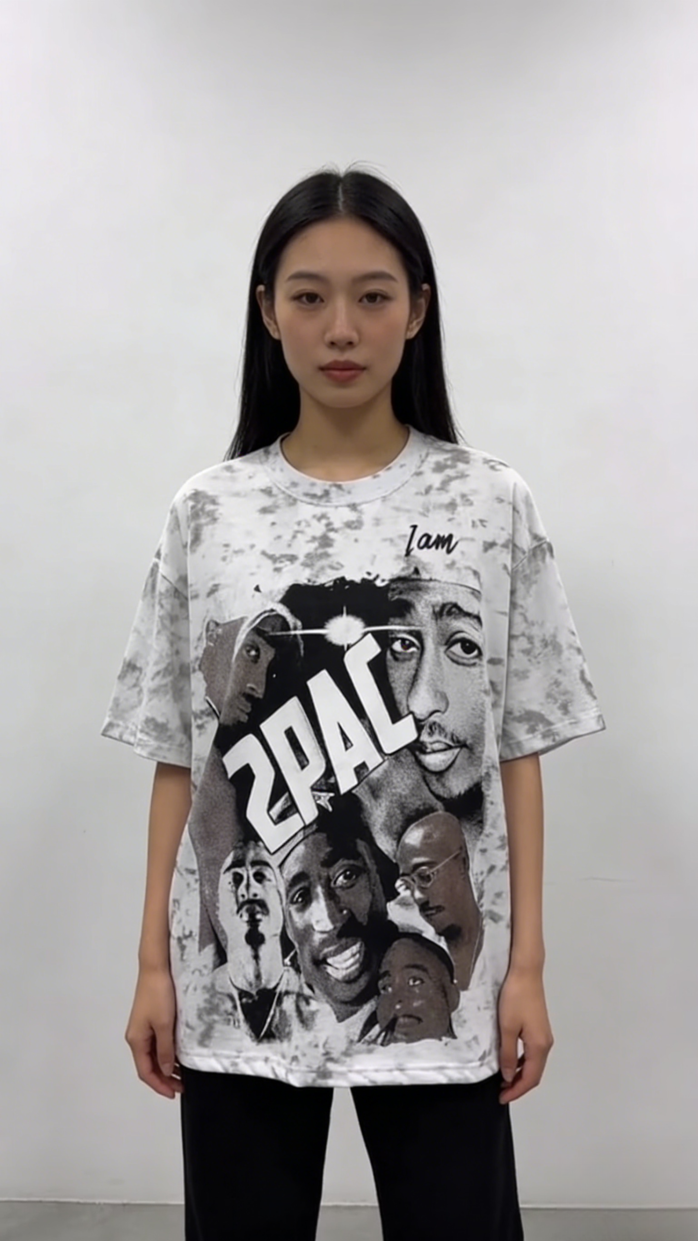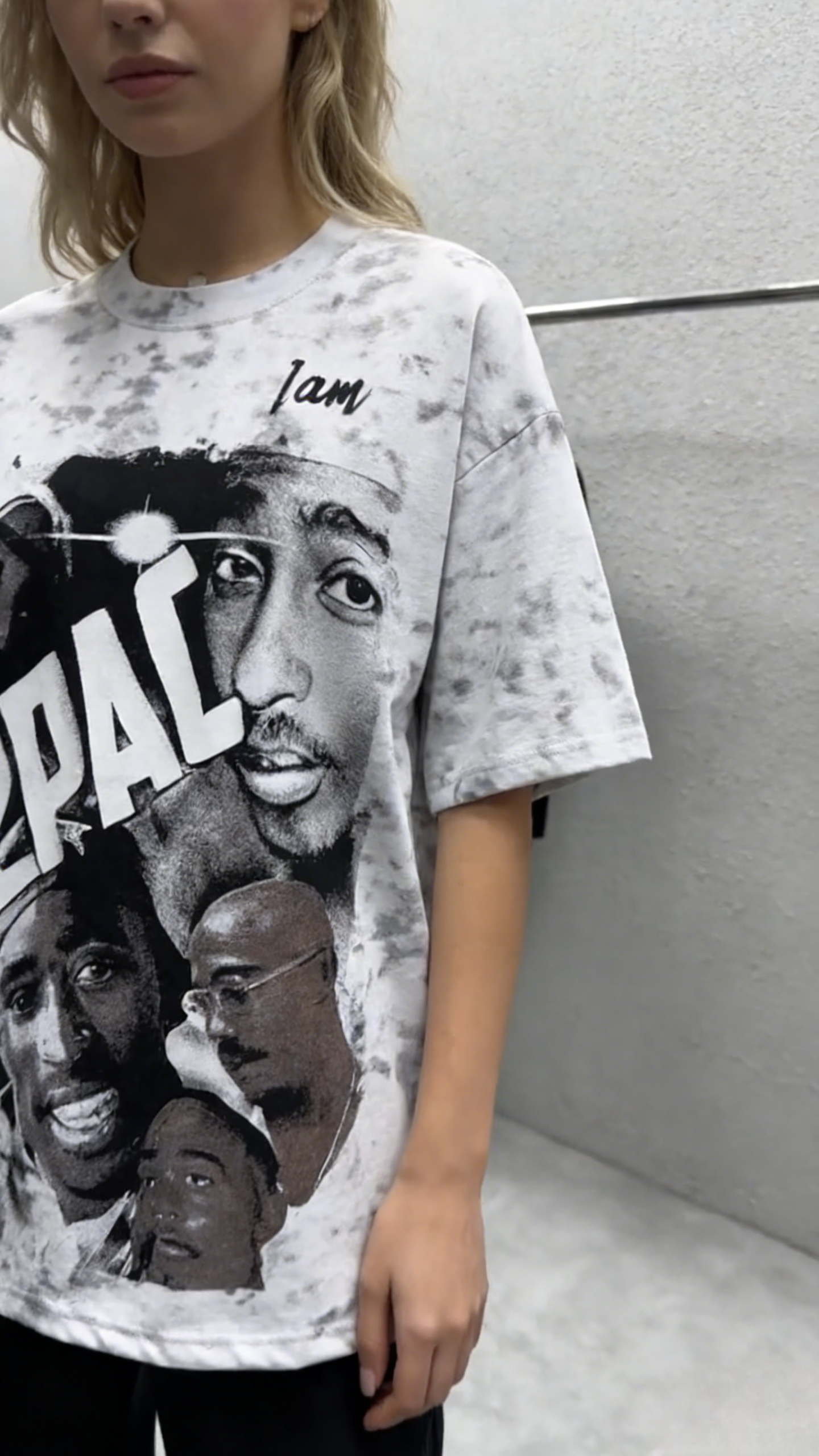 - Key Design Elements: Marble tie-dye base with subtle gray veining, paired with a collage of 2Pac (Tupac Shakur) portraits, reversed “2PAC” lettering, and cursive “I am” text at the neckline, creating a retro hip-hop vibe.