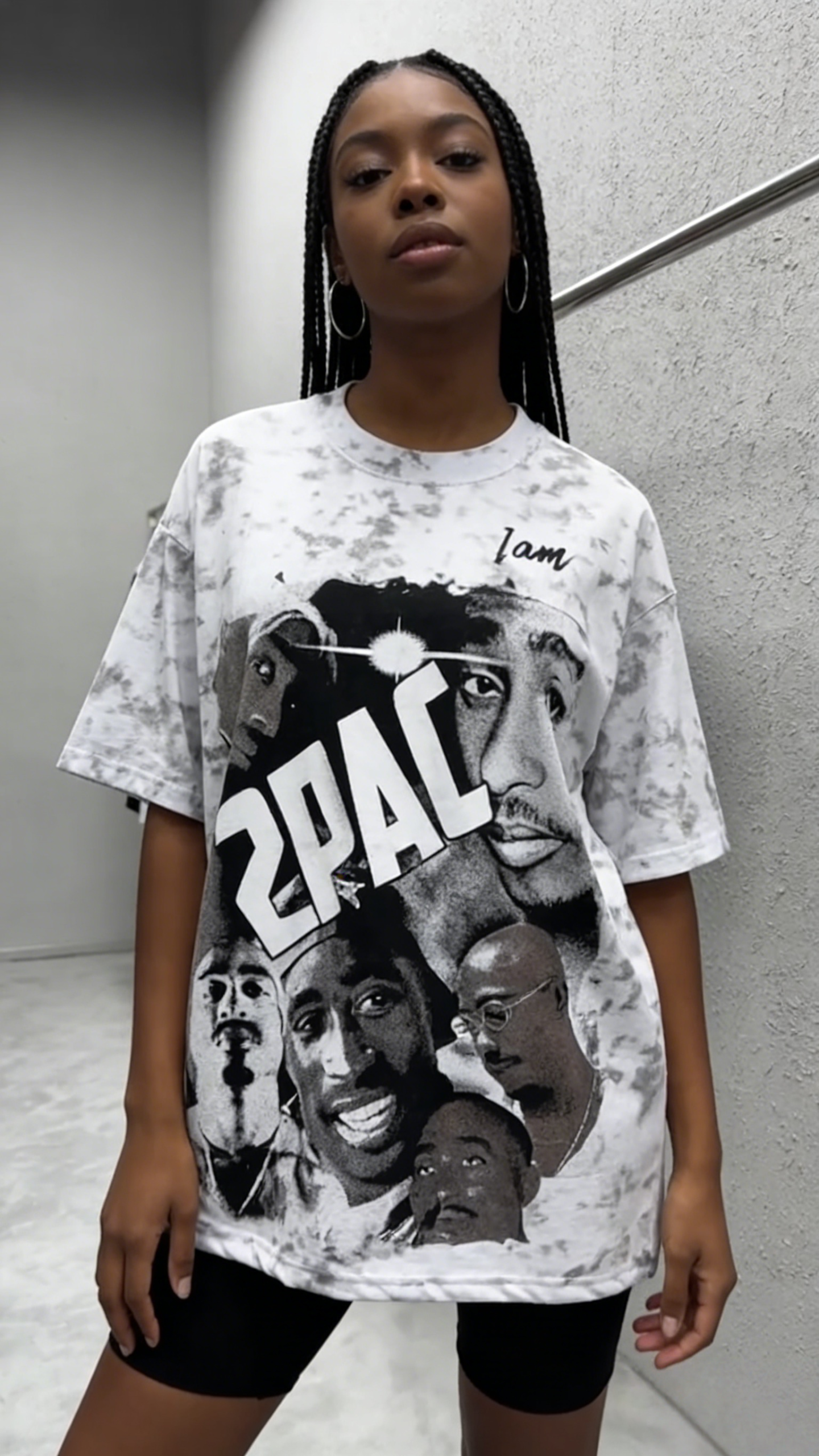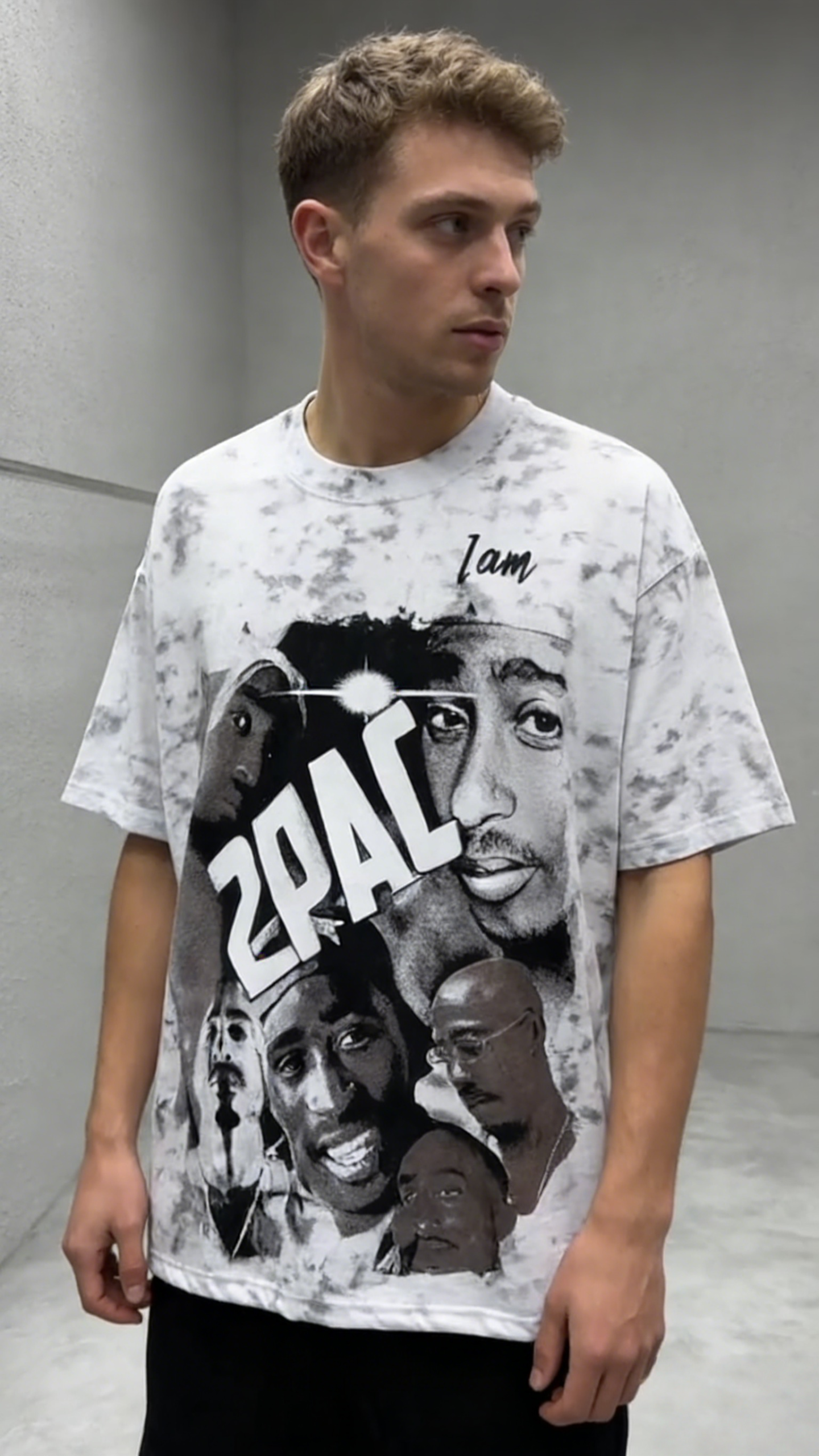 - Design: Marble tie-dye base with “I am” script + “2PAC” vintage rap collage graphic