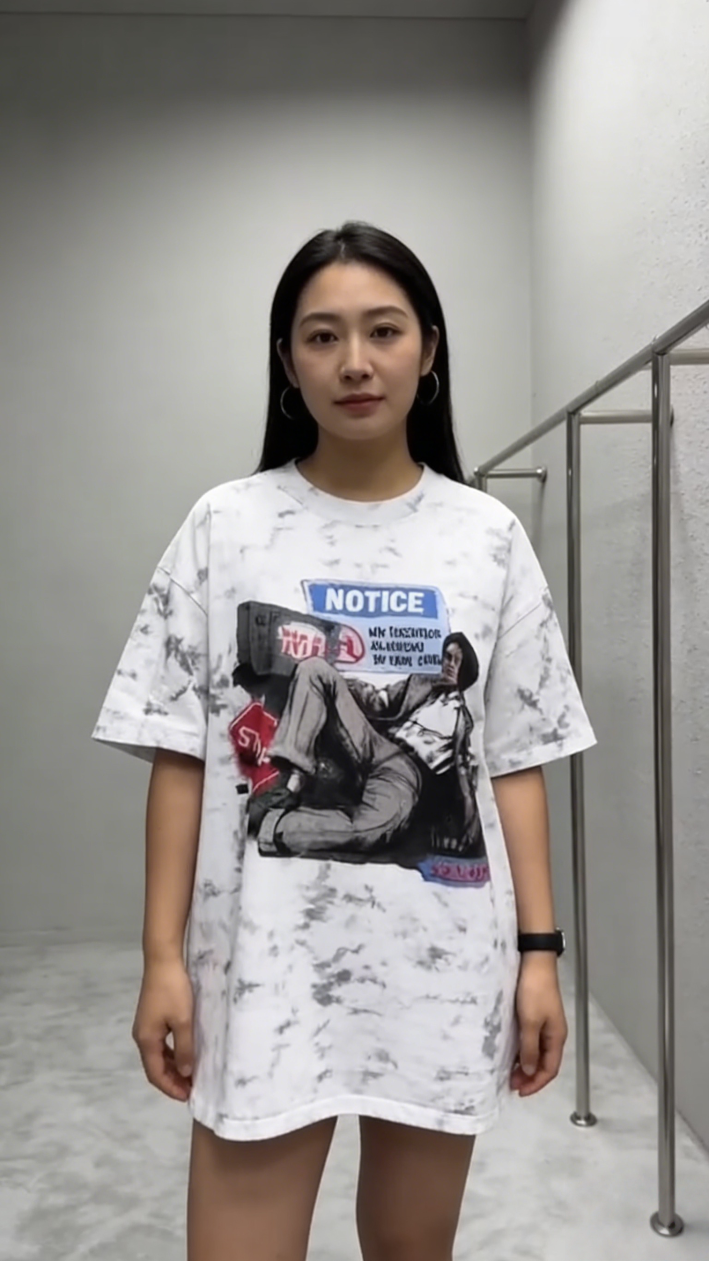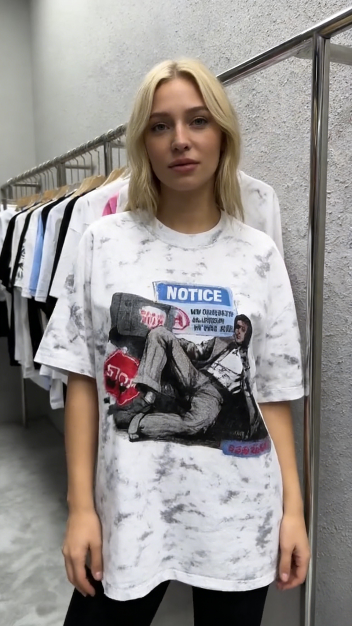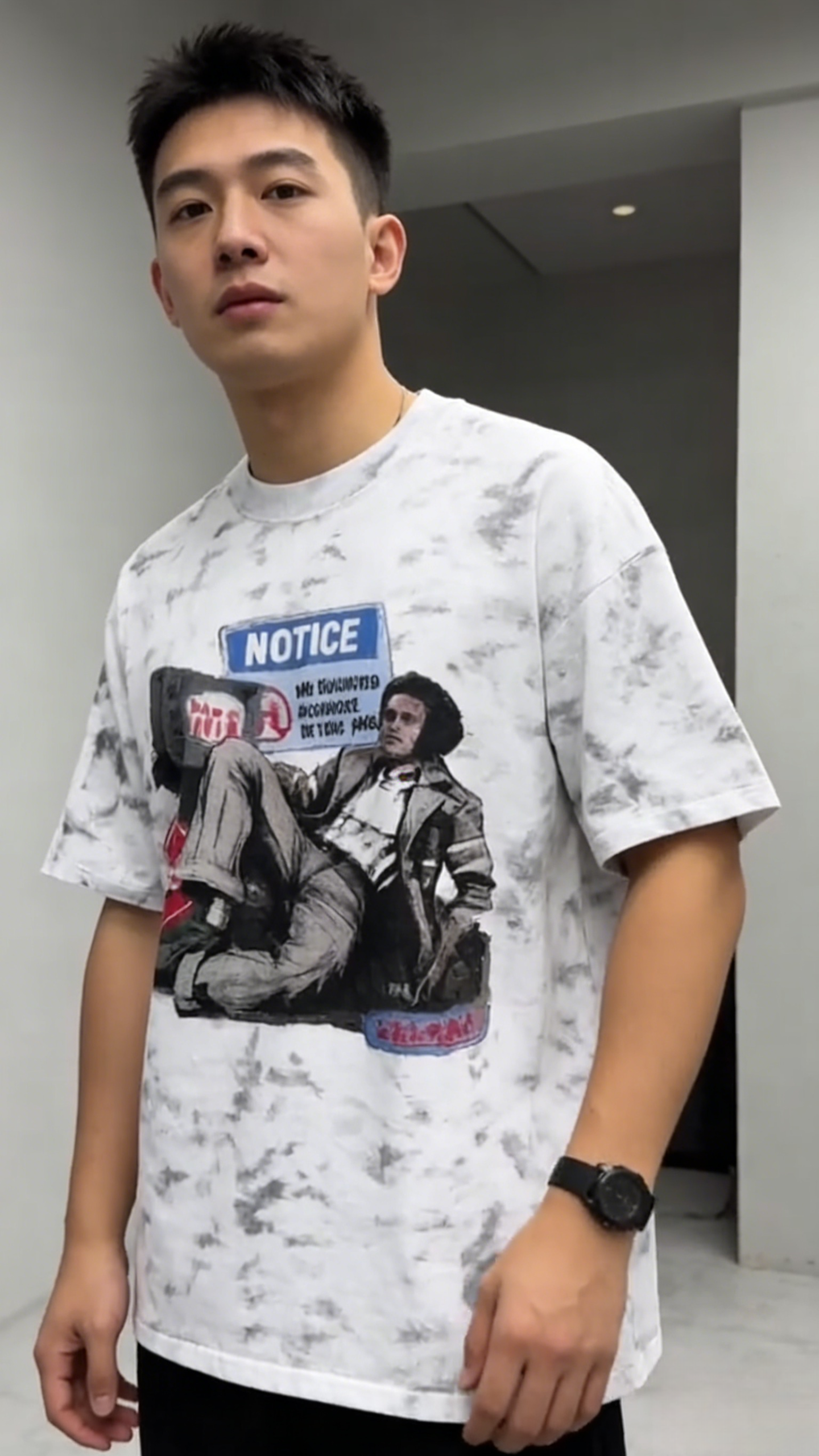 - Key Design Elements: Marble tie-dye base with subtle gray veining, paired with a “NOTICE” sign graphic and a vintage-style character illustration, creating a nostalgic, streetwear vibe.
