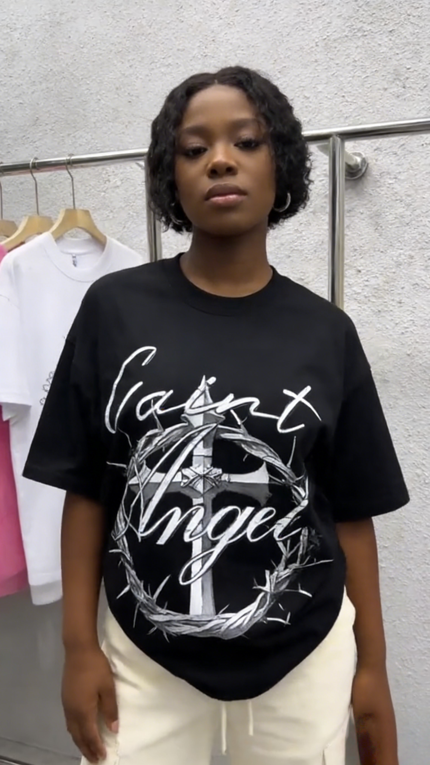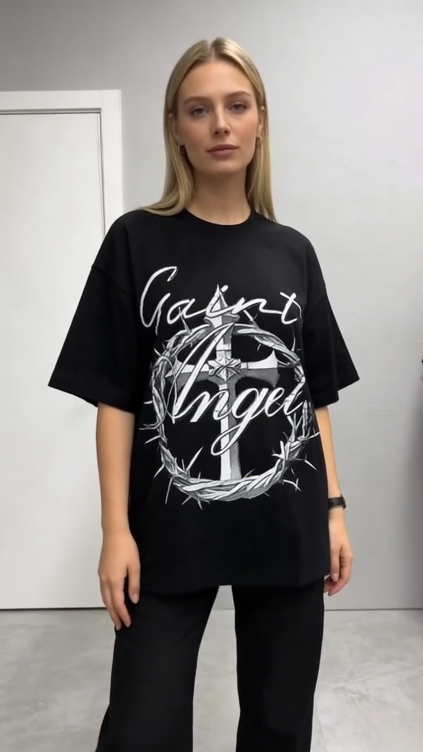 - Key Design Elements: Cursive “Saint Angel” lettering, a detailed cross, and a crown of thorns graphic, creating a dark, religious streetwear vibe.