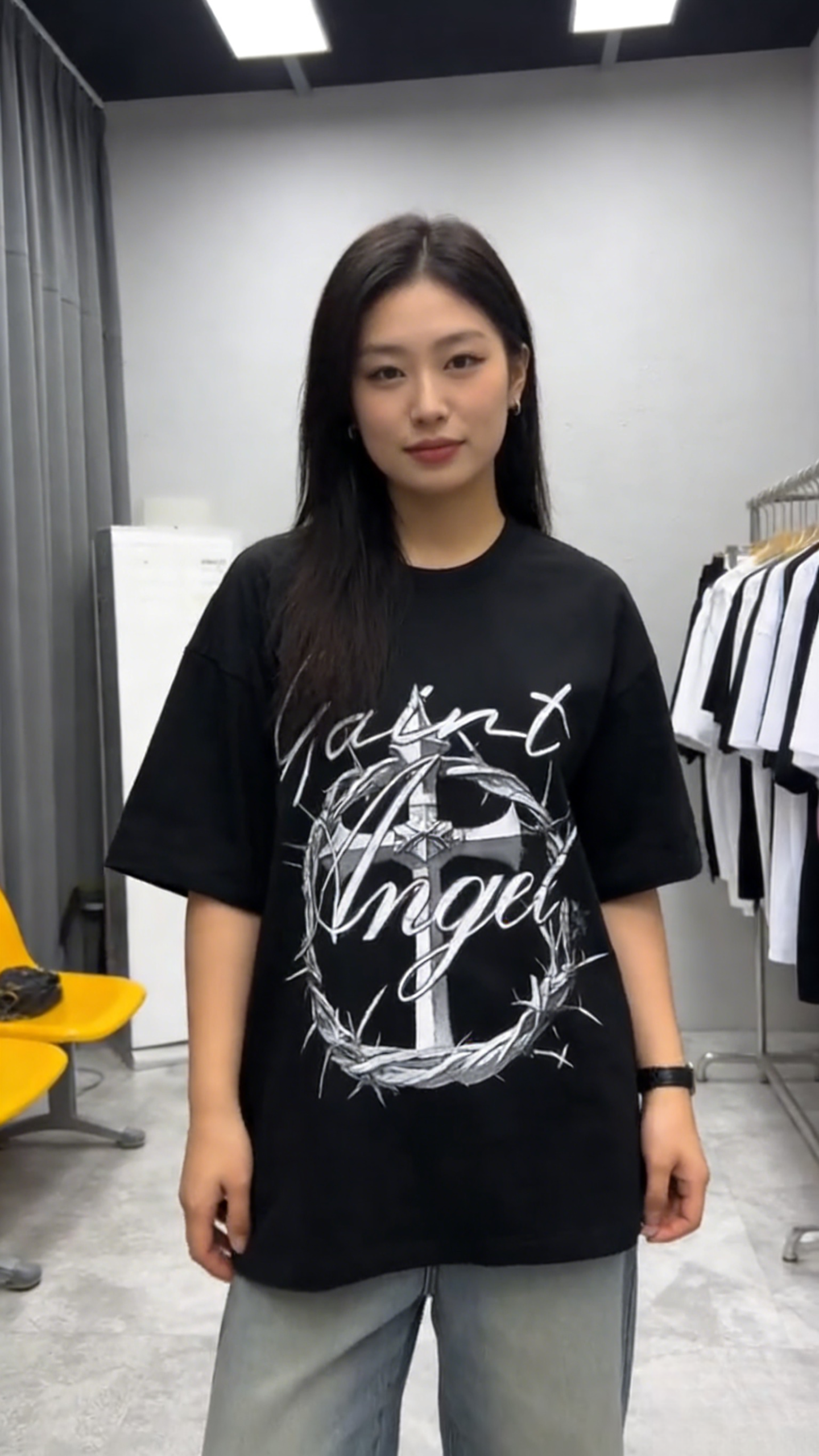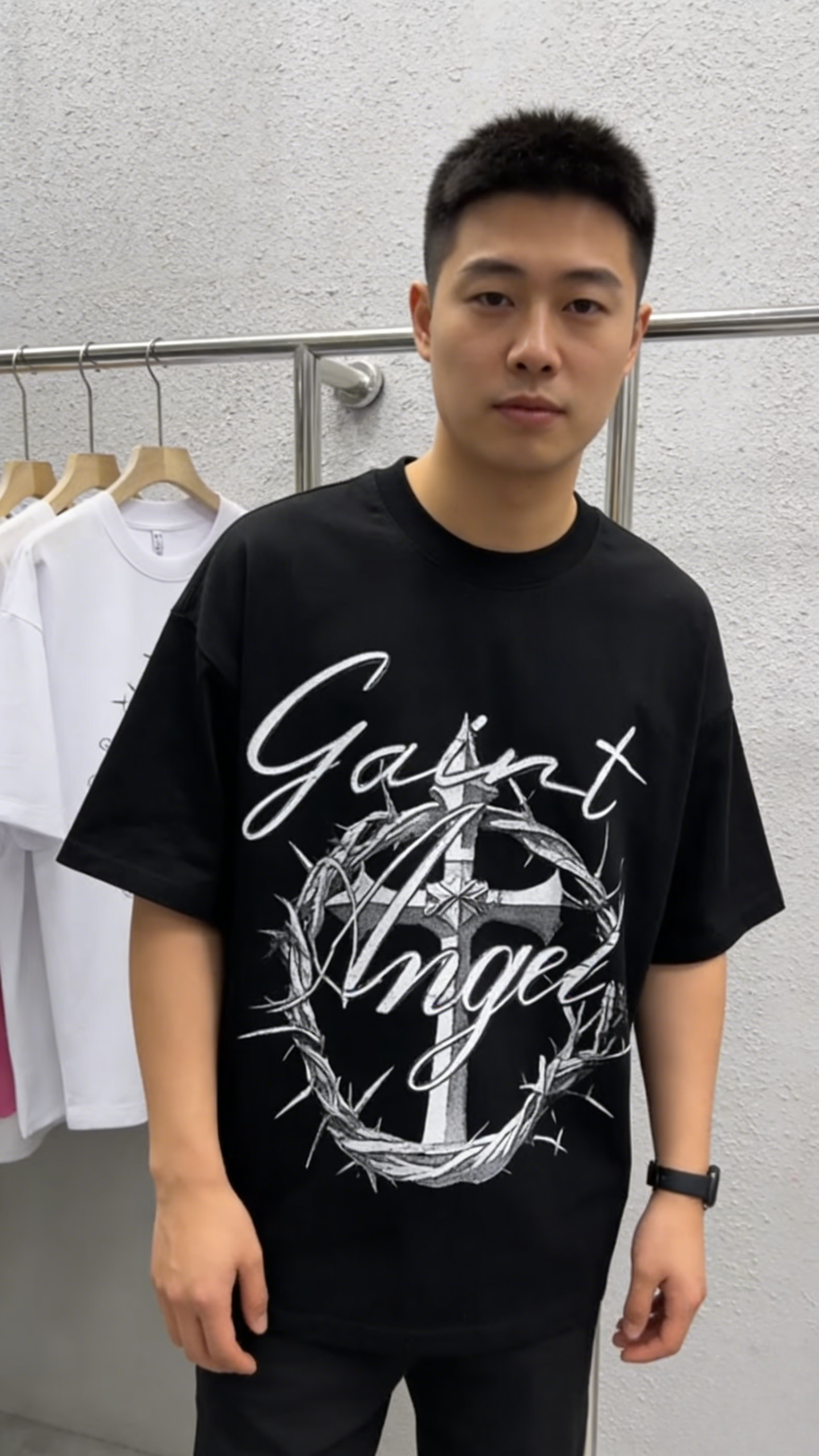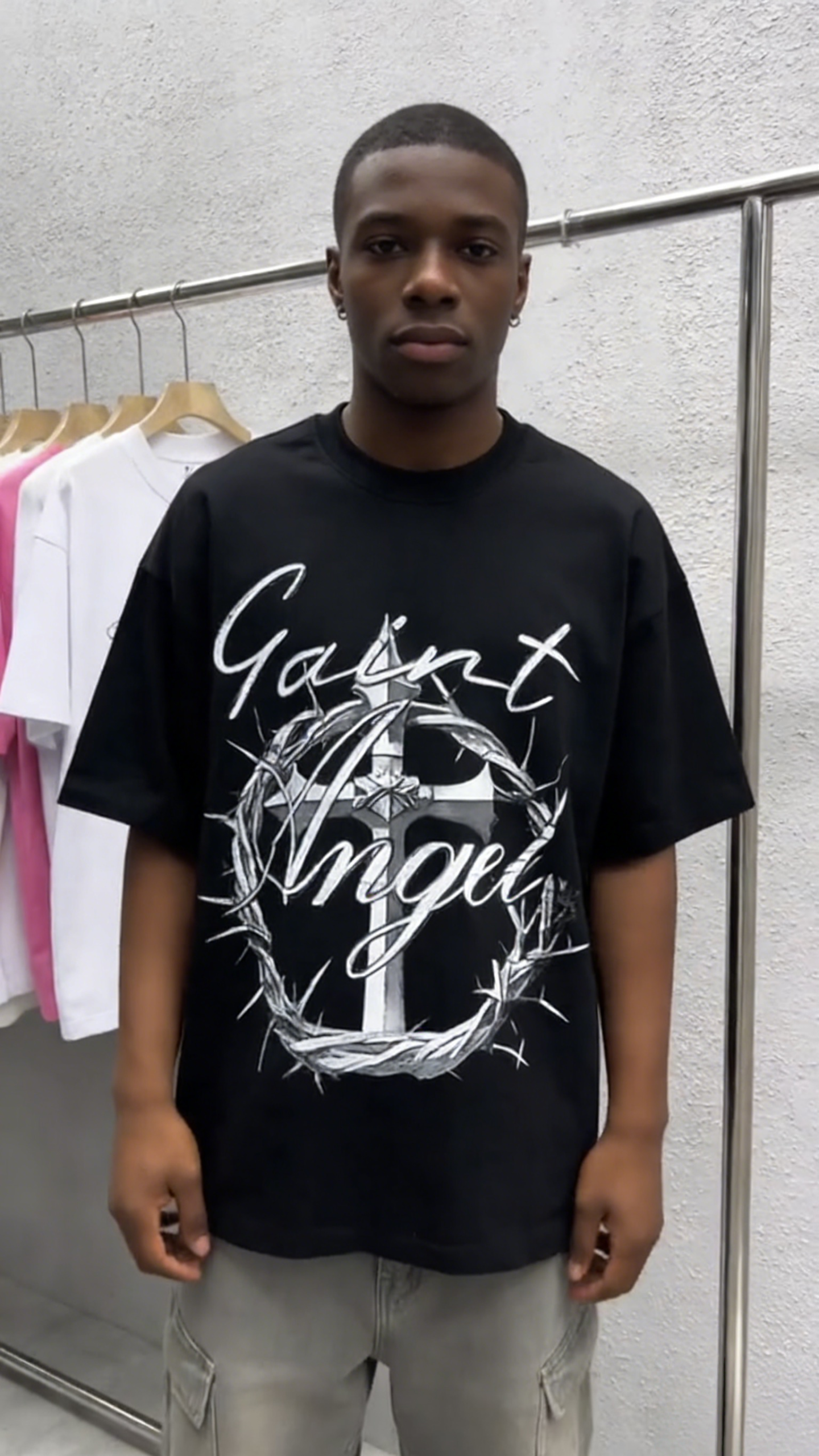 - Primary Keywords: 100% cotton T-shirt, oversized streetwear T-shirt, “Saint Angel” graphic tee, gothic cross cotton shirt, wholesale cotton T-shirts