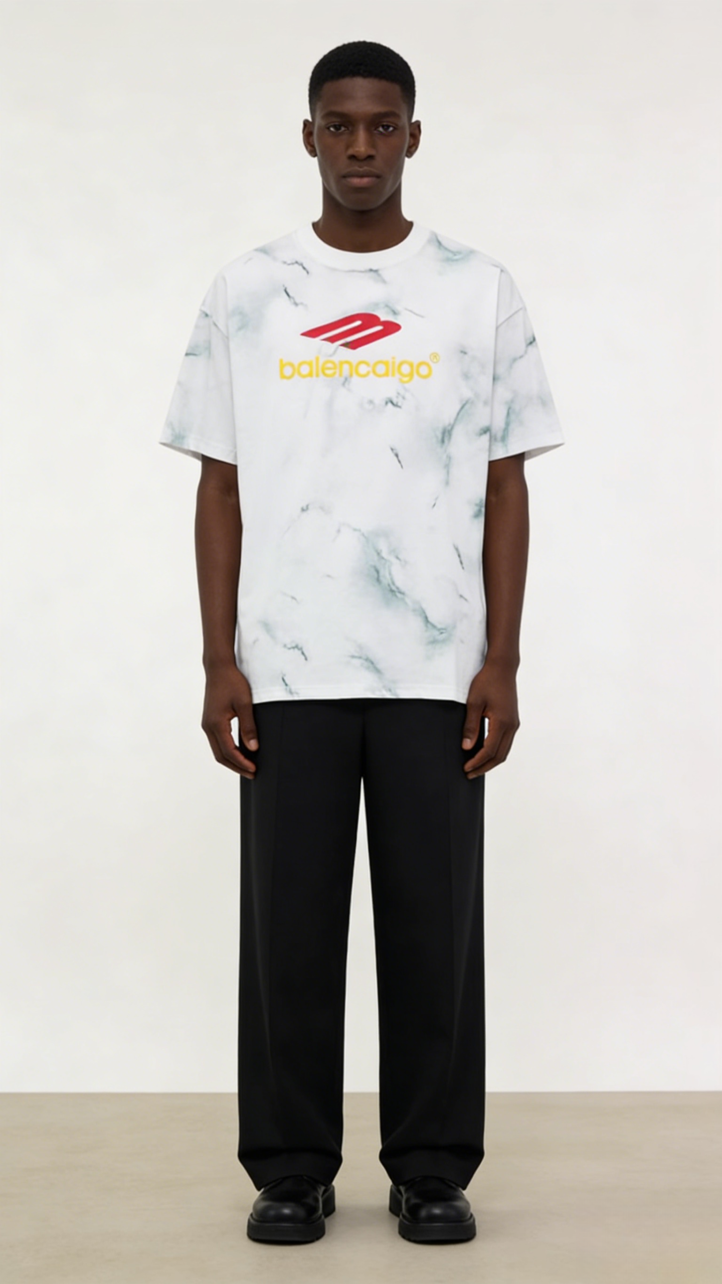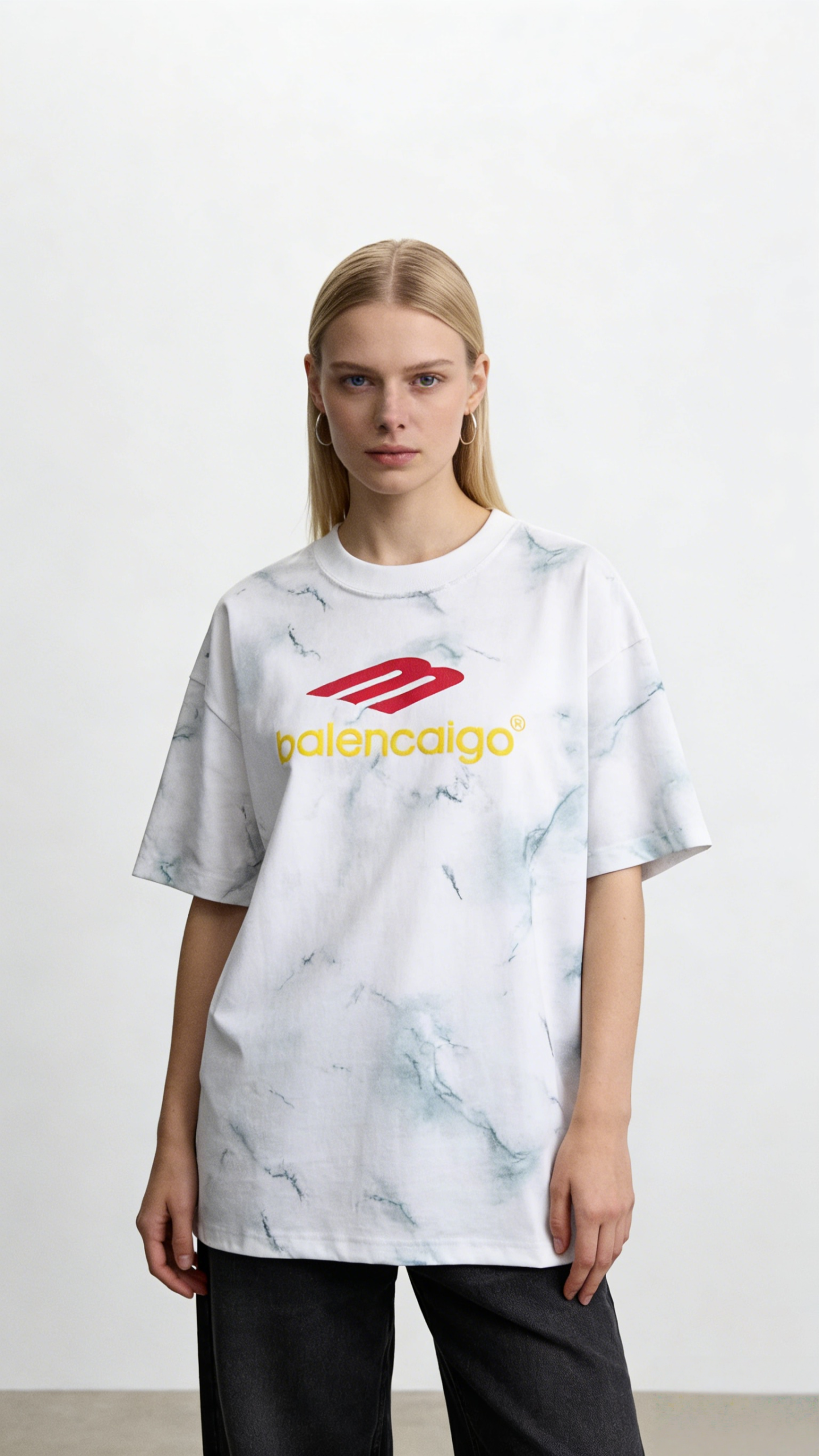 - Key Design Elements: Marble-patterned tie-dye base with subtle blue-green veining, paired with a red stylized “B” logo and yellow “balencaigo” text, creating a minimalist yet striking streetwear look.