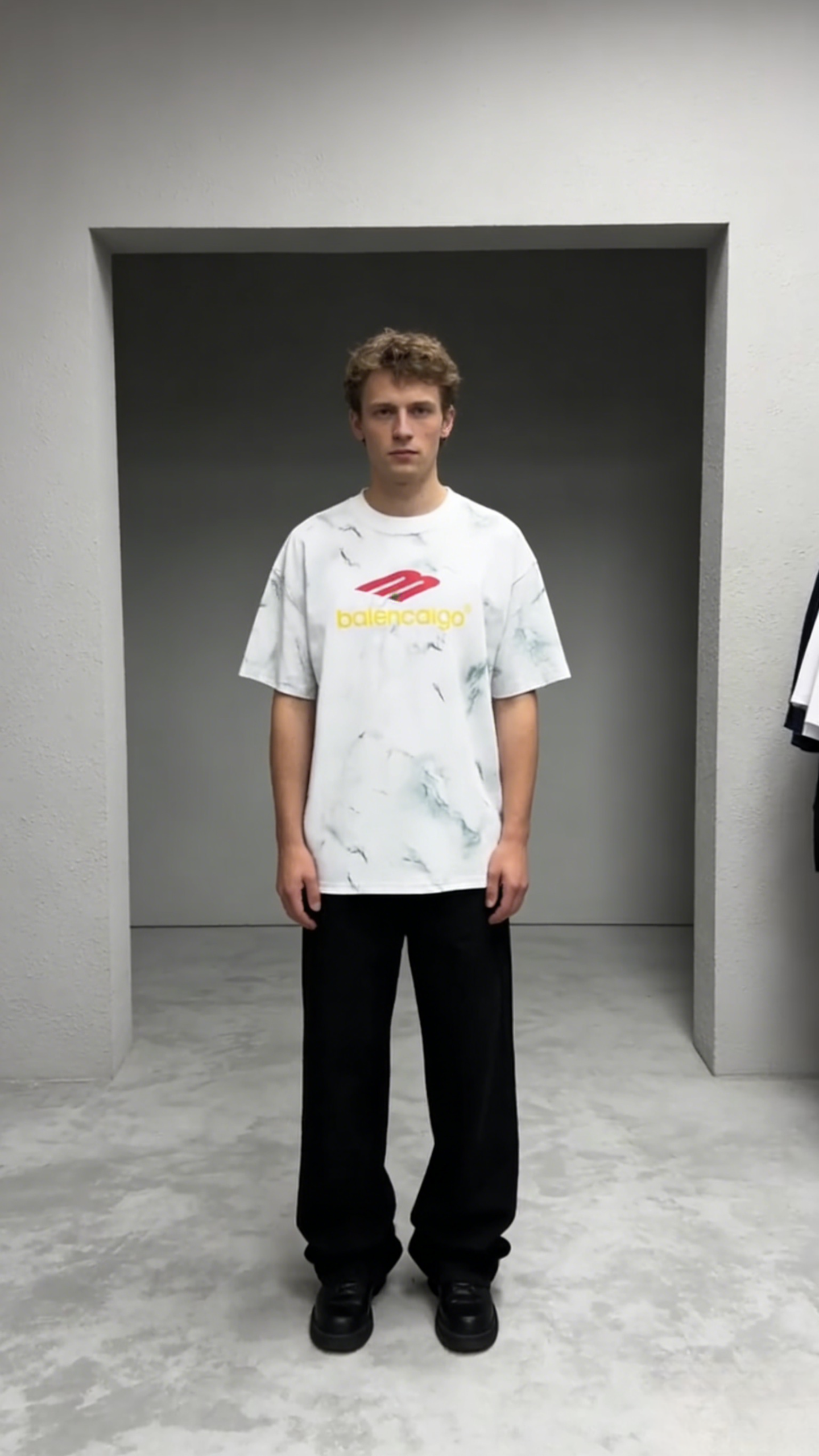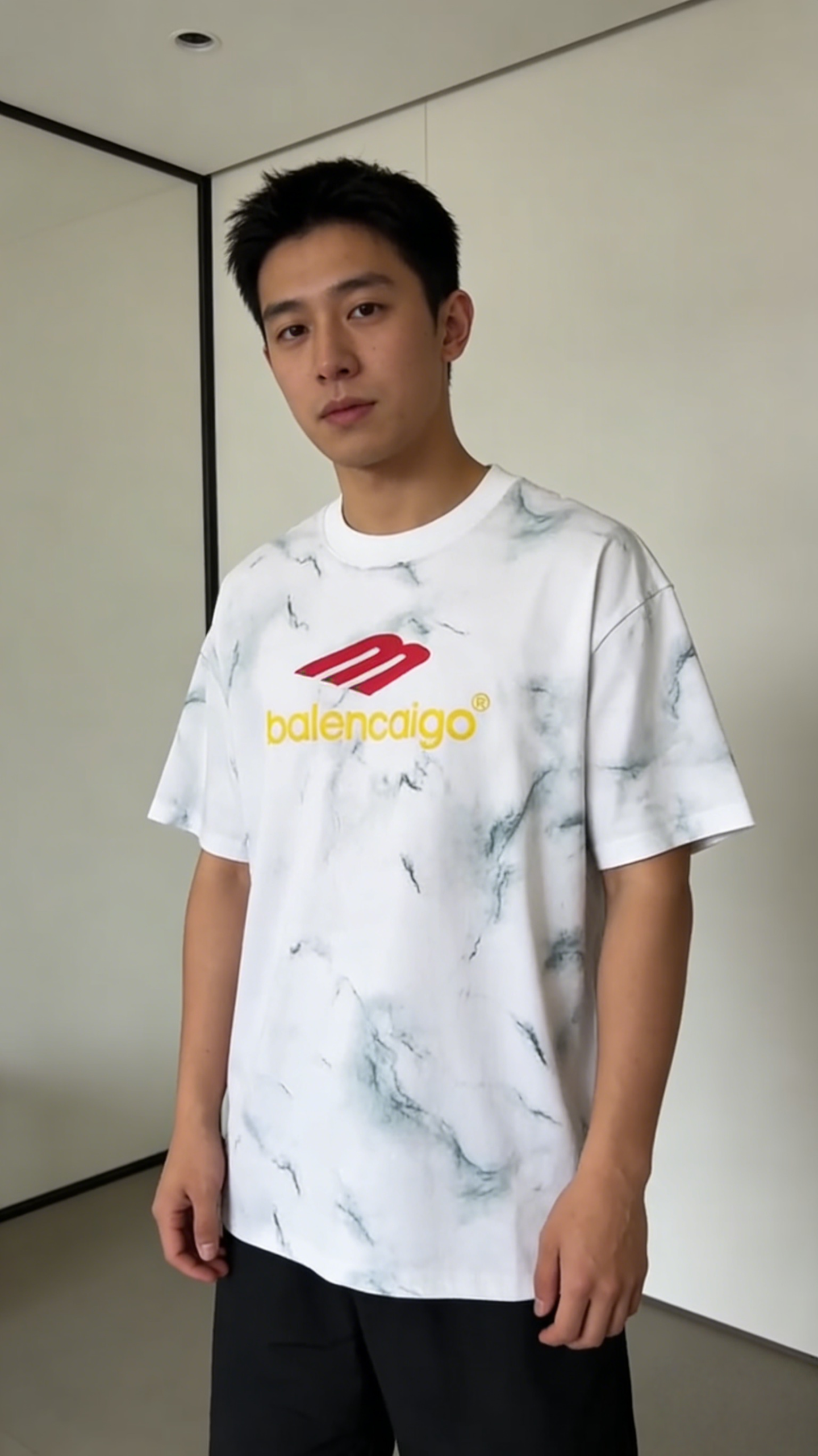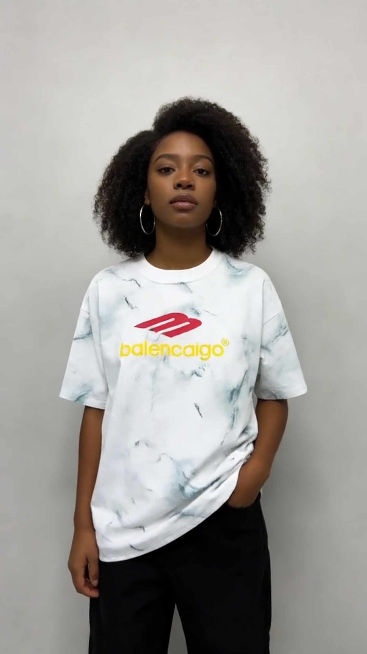 - Design: Marble tie-dye base with red “B” logo & yellow “balencaigo” text